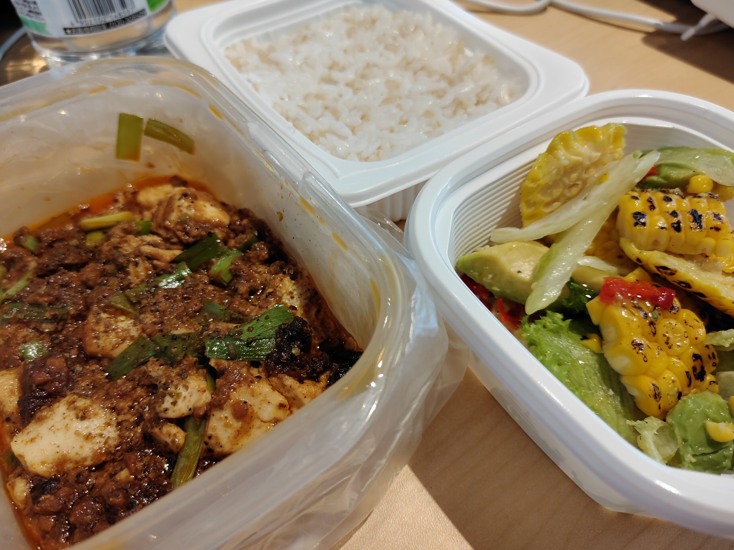 昼ごはんは、華音まかないの麻婆豆腐とグリーングルメのコーンとアボカドのサラダ。