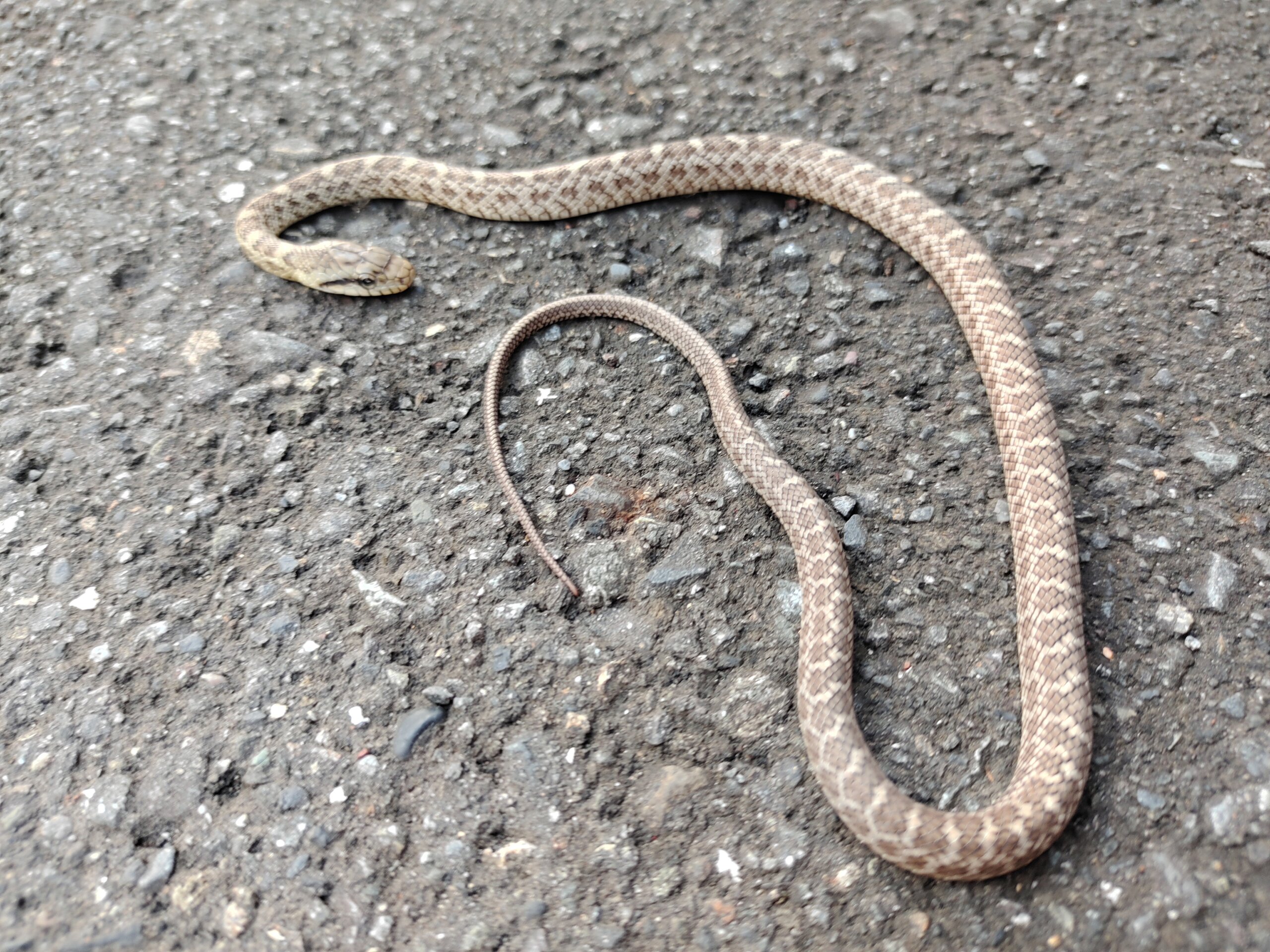 だいぶ涼しくなってきたし、朝ウォーキング再開しようかな、ちょっと外でてみよ・・・と、庭へでると、自宅前のアスファルト道路の上に、小さな蛇くんが・・・・