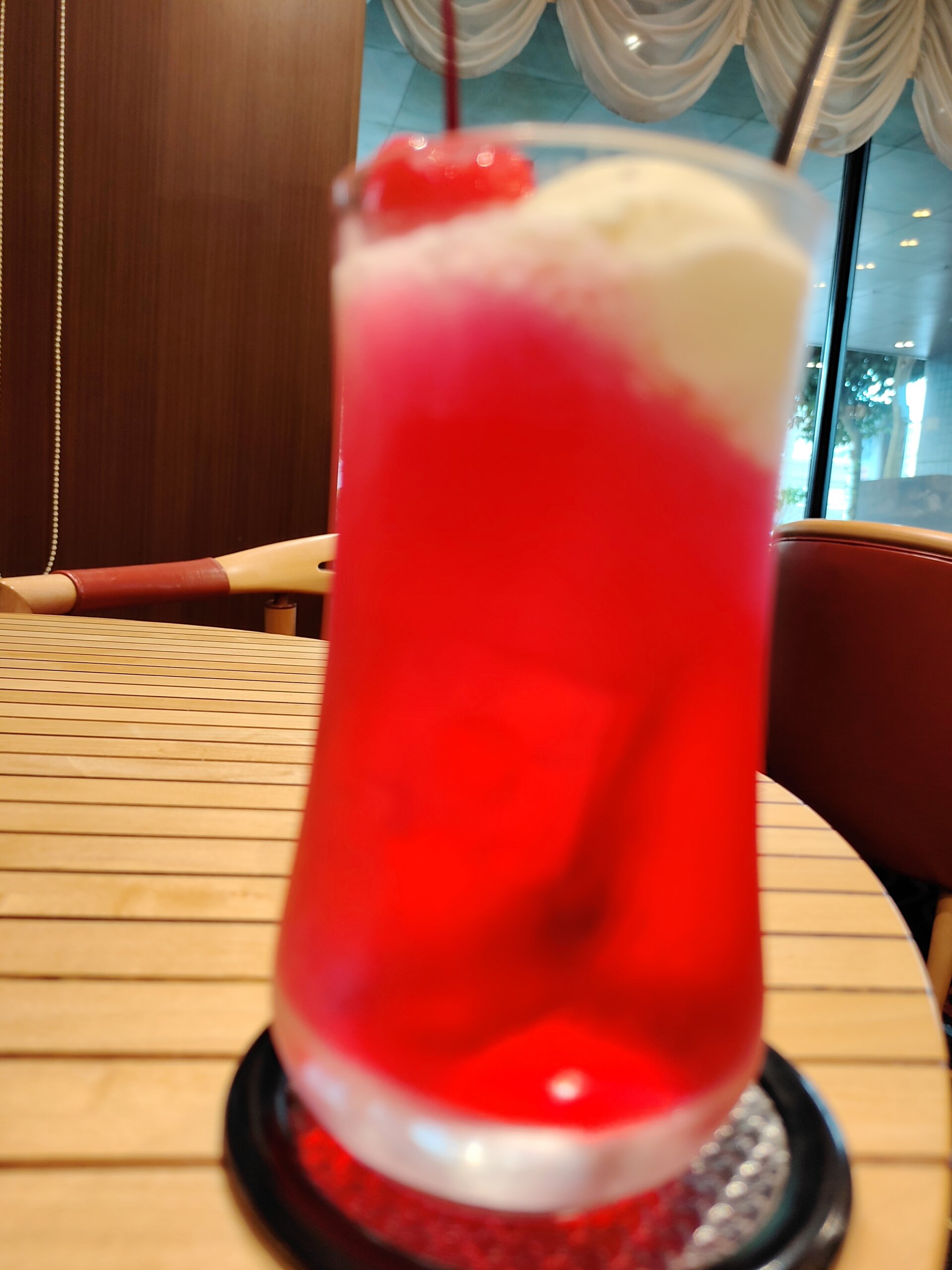 カフェで、いちごクリームソーダ