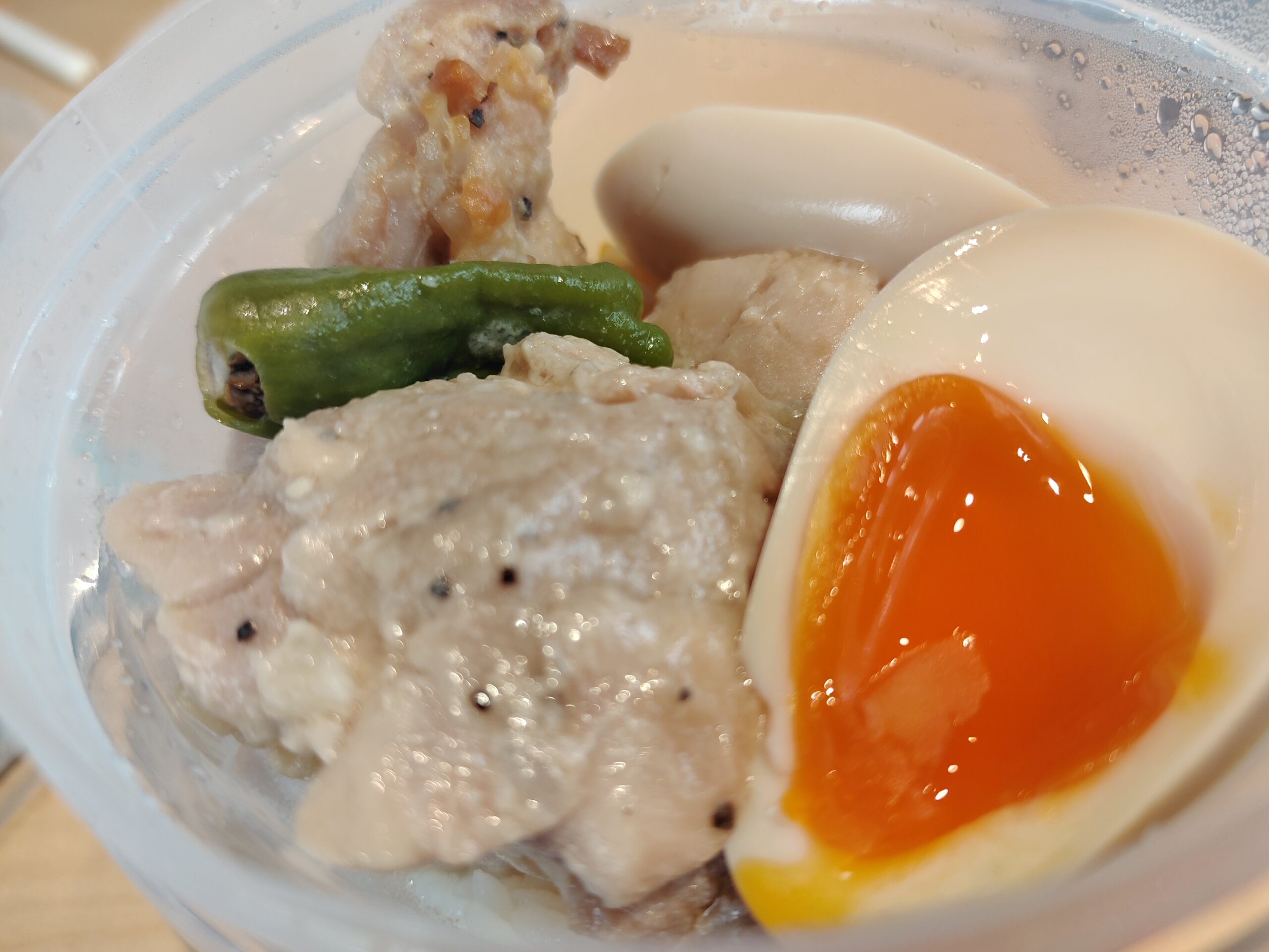 昼は、御幸町事務所まで戻り、きのうの夕方パルシェ食品館でかった、ジャンボ焼きとりと煮卵をトッピングした発芽玄米ごはんで、ランチ