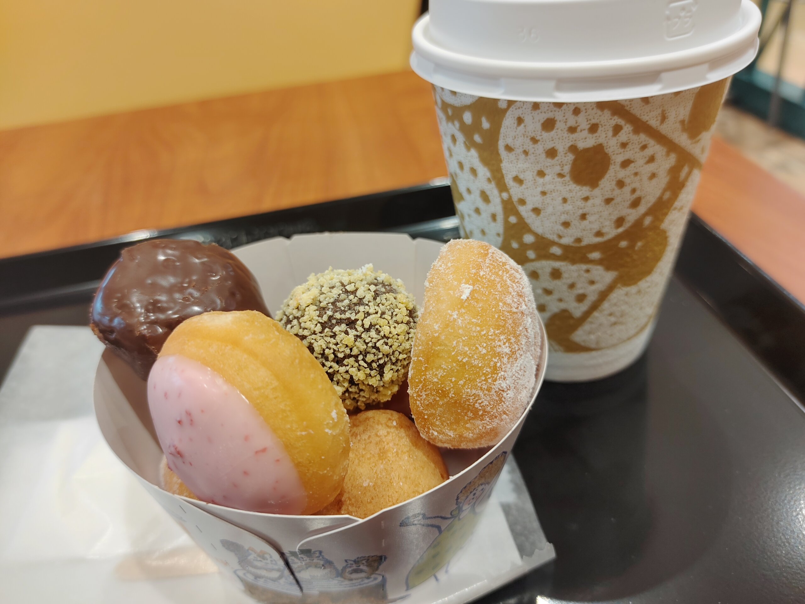 自転車で行く気満々だったけれど、雨模様で、電車で、自動車学校へ。時間早かったので、ミスタードーナッツで、おやつ。