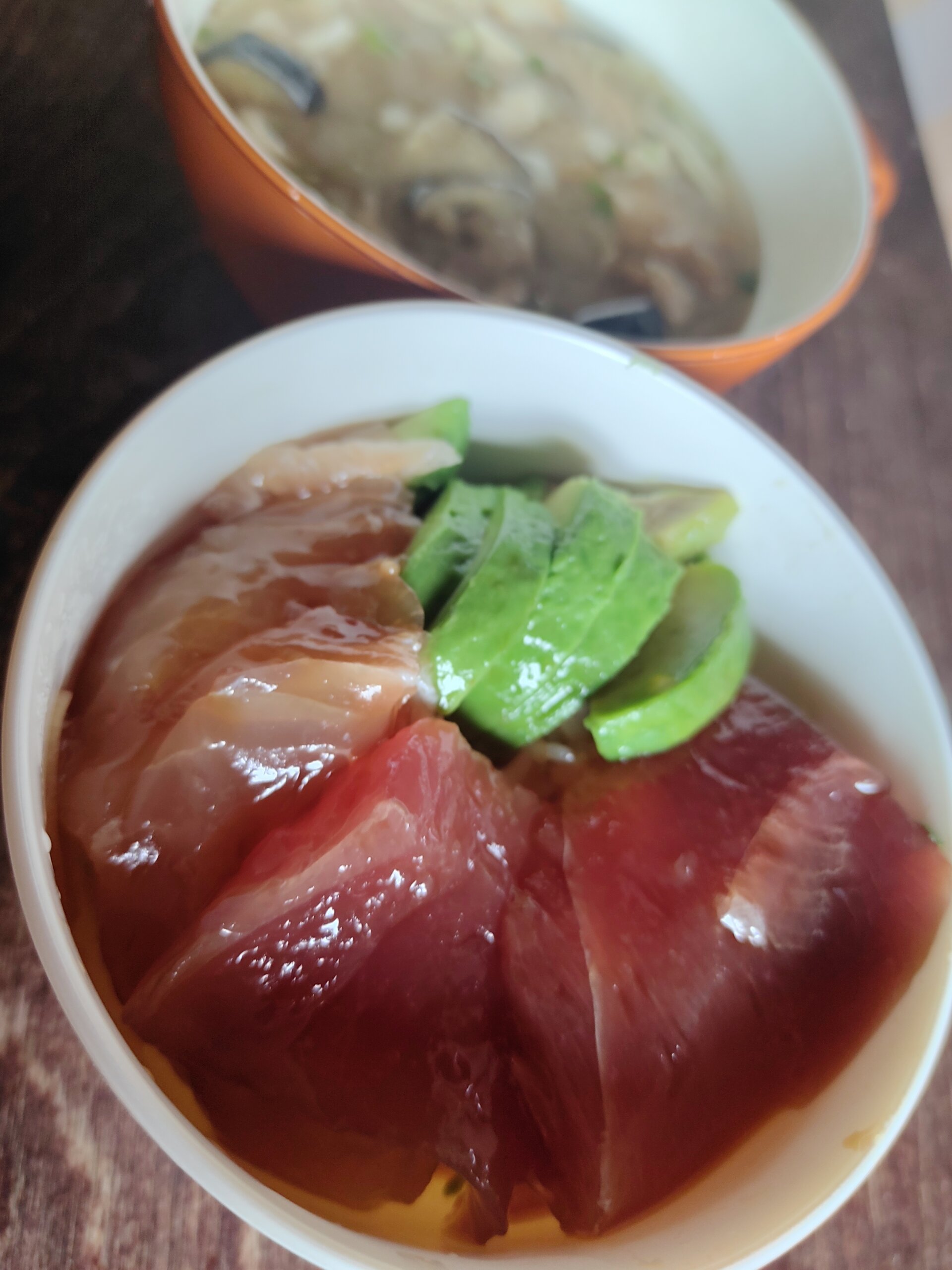 自宅に戻り、昨日のお刺身漬けを使ってアボカドと海鮮漬け丼でお昼。