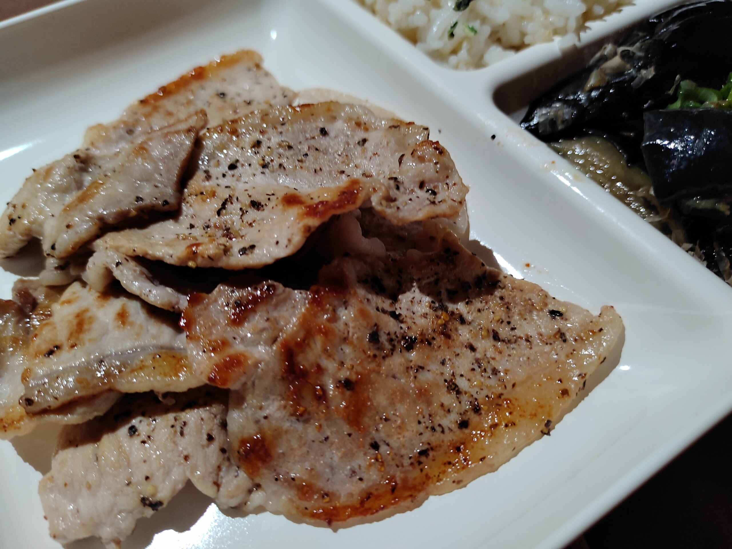 晩ごはんは、茄子の揚げびたしと、豚ロース塩焼。夜、豚肉なのを忘れて昼とダブっちゃった、まあ、ビタミンB補給ってことでいいや。