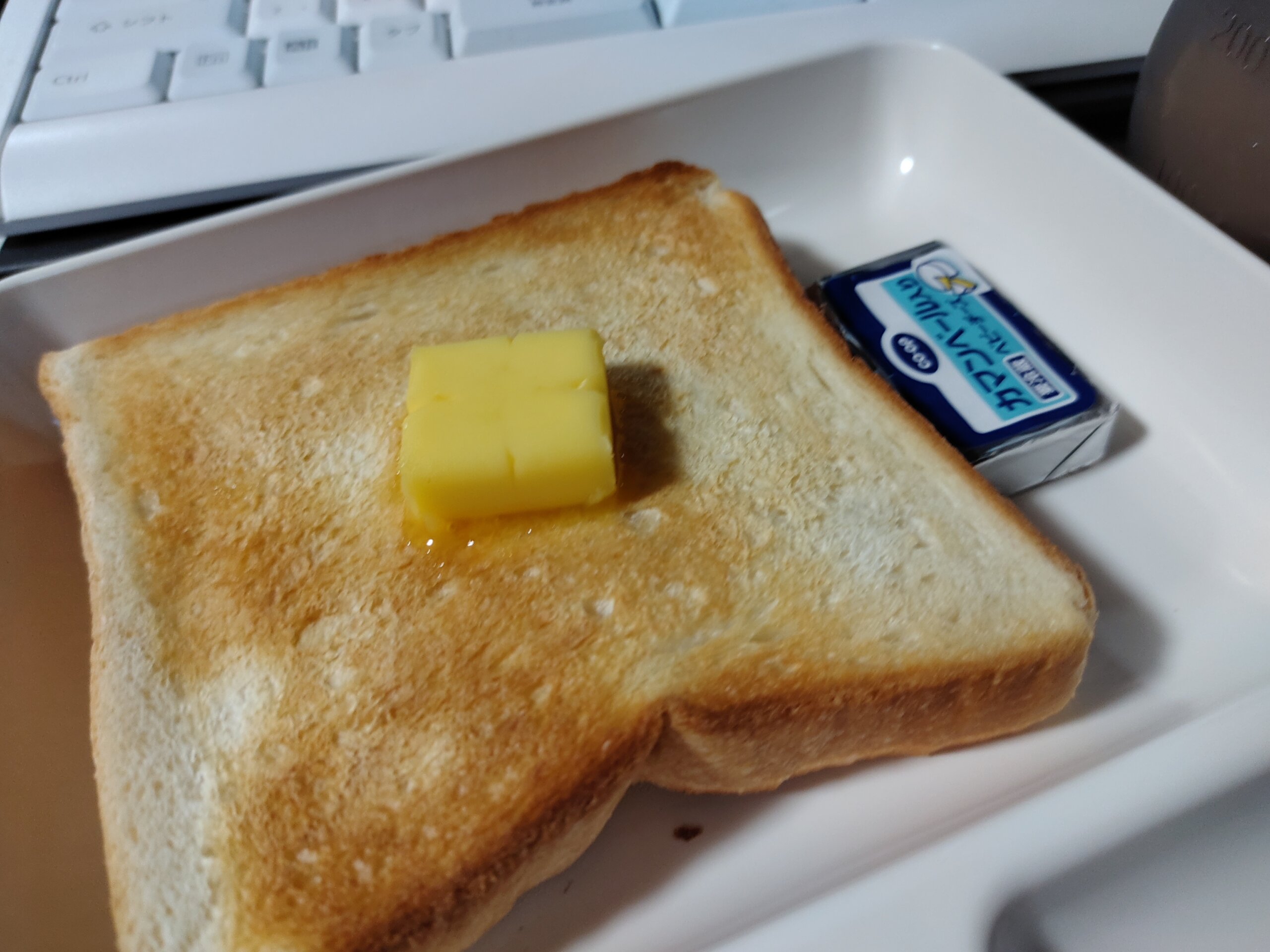 朝ごはんは、バタートーストとチーズ、プロティン。