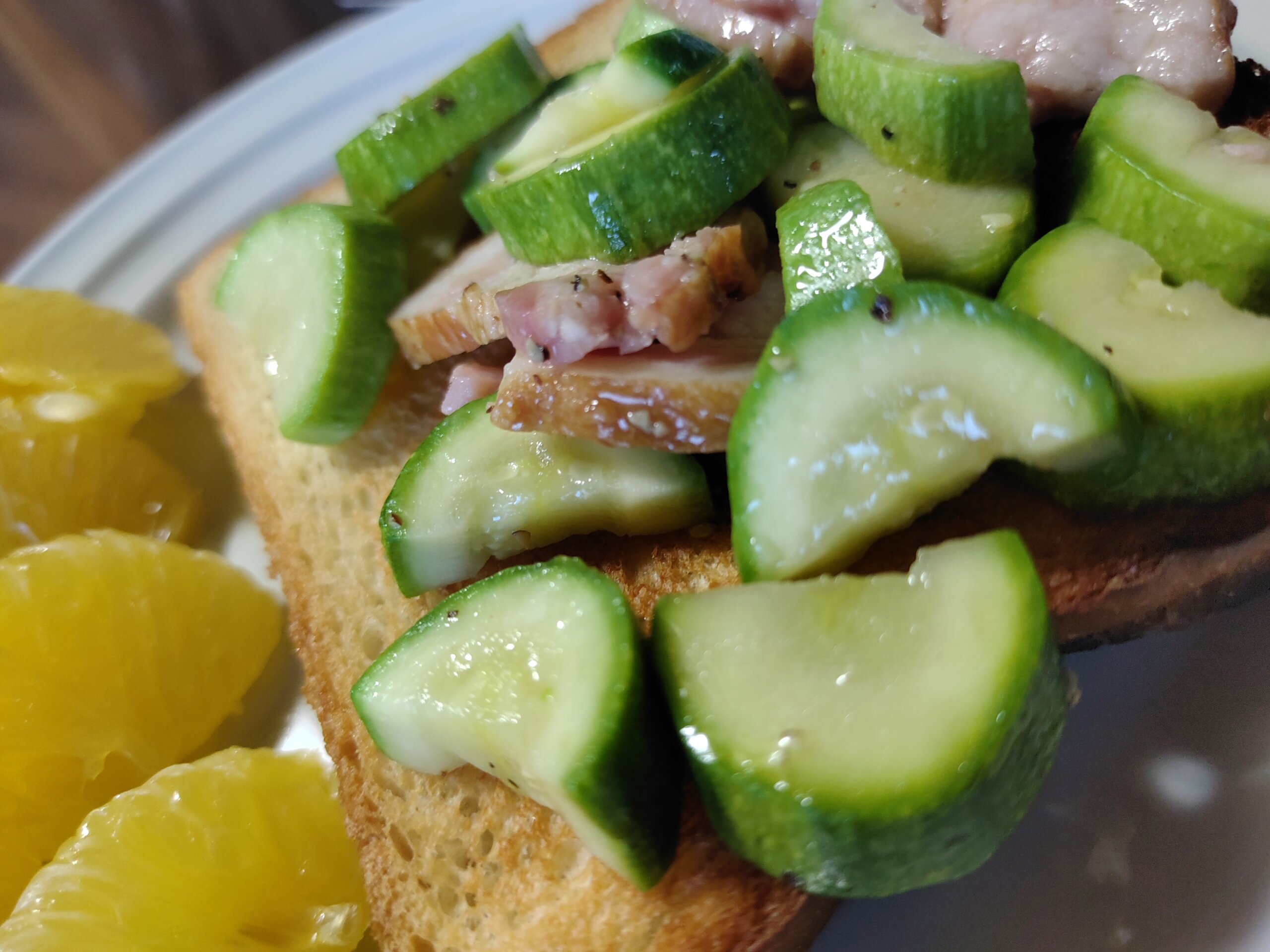 朝ごはんは、トーストに、ズッキーニとベーコンをトッピング、夏みかん。