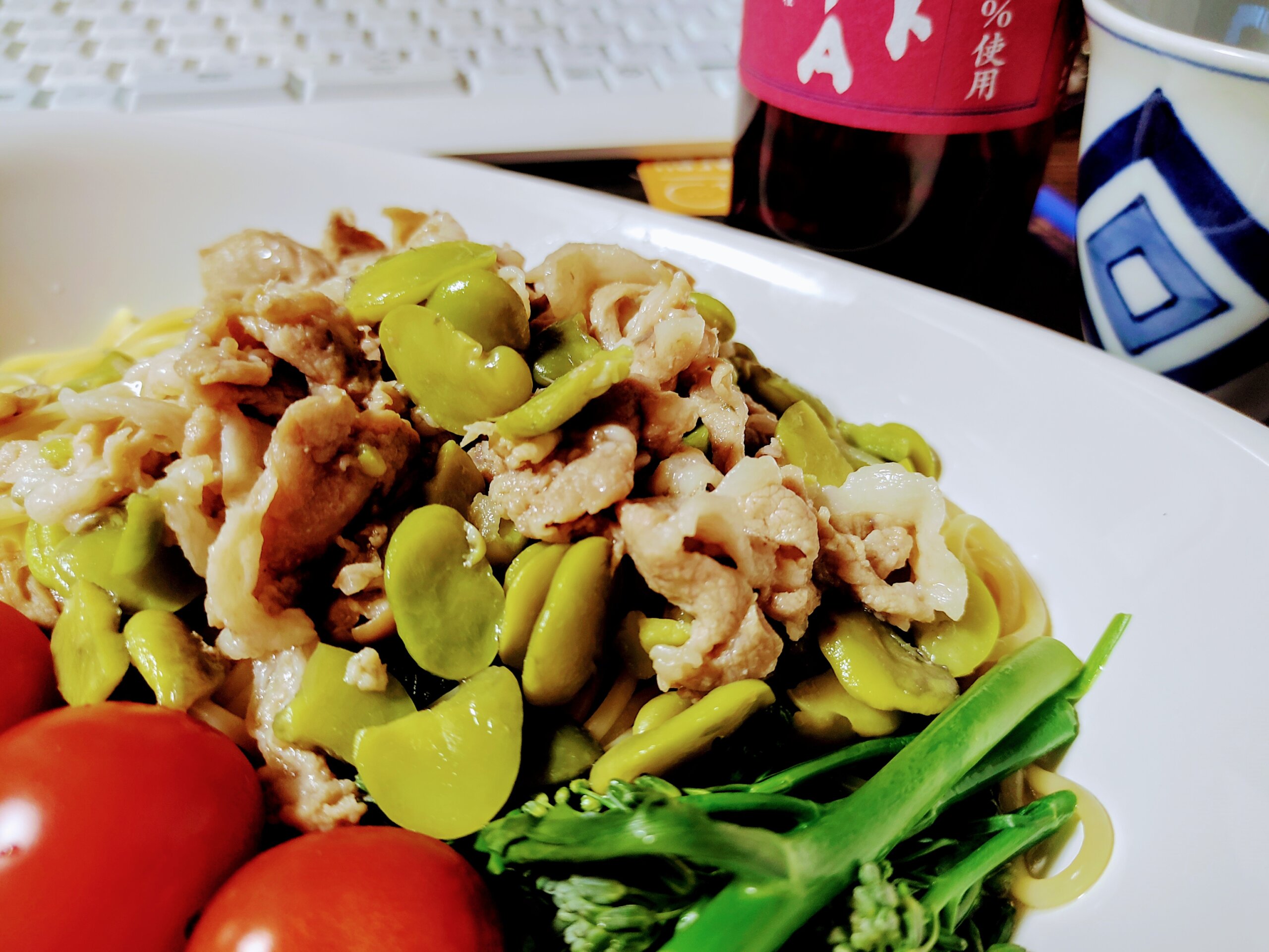 ナスとピーマンの炒めもの、ソラマメと豚肉の昆布つゆ浸し、スナップエンドウのガーリック炒め
