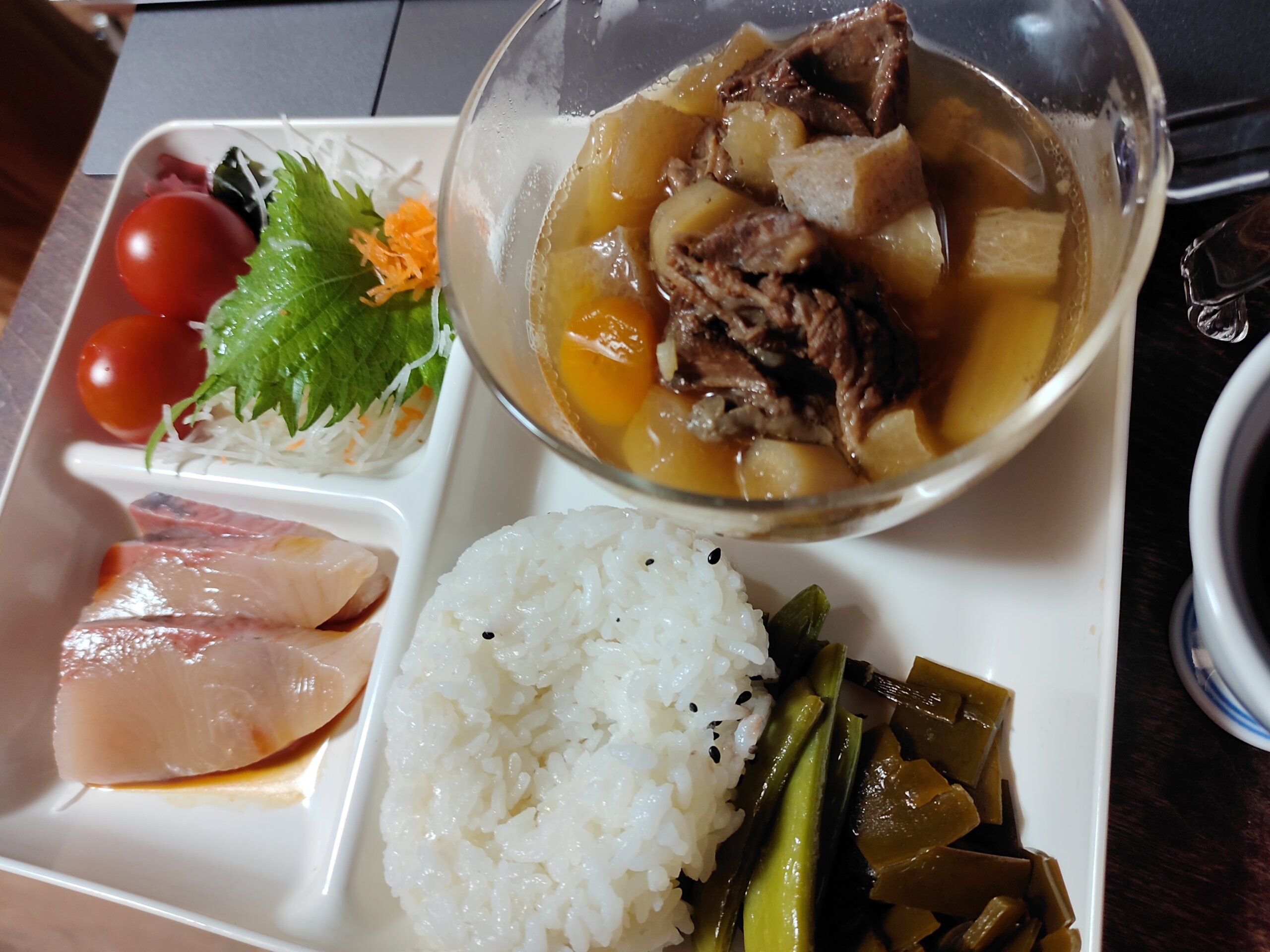 牛すじの煮込み、ブリのお刺身、ツマはレモンドレッシングでサラダに。昆布の佃煮、スナップエンドウ。きのうの赤ワインもあって、シアワセ。