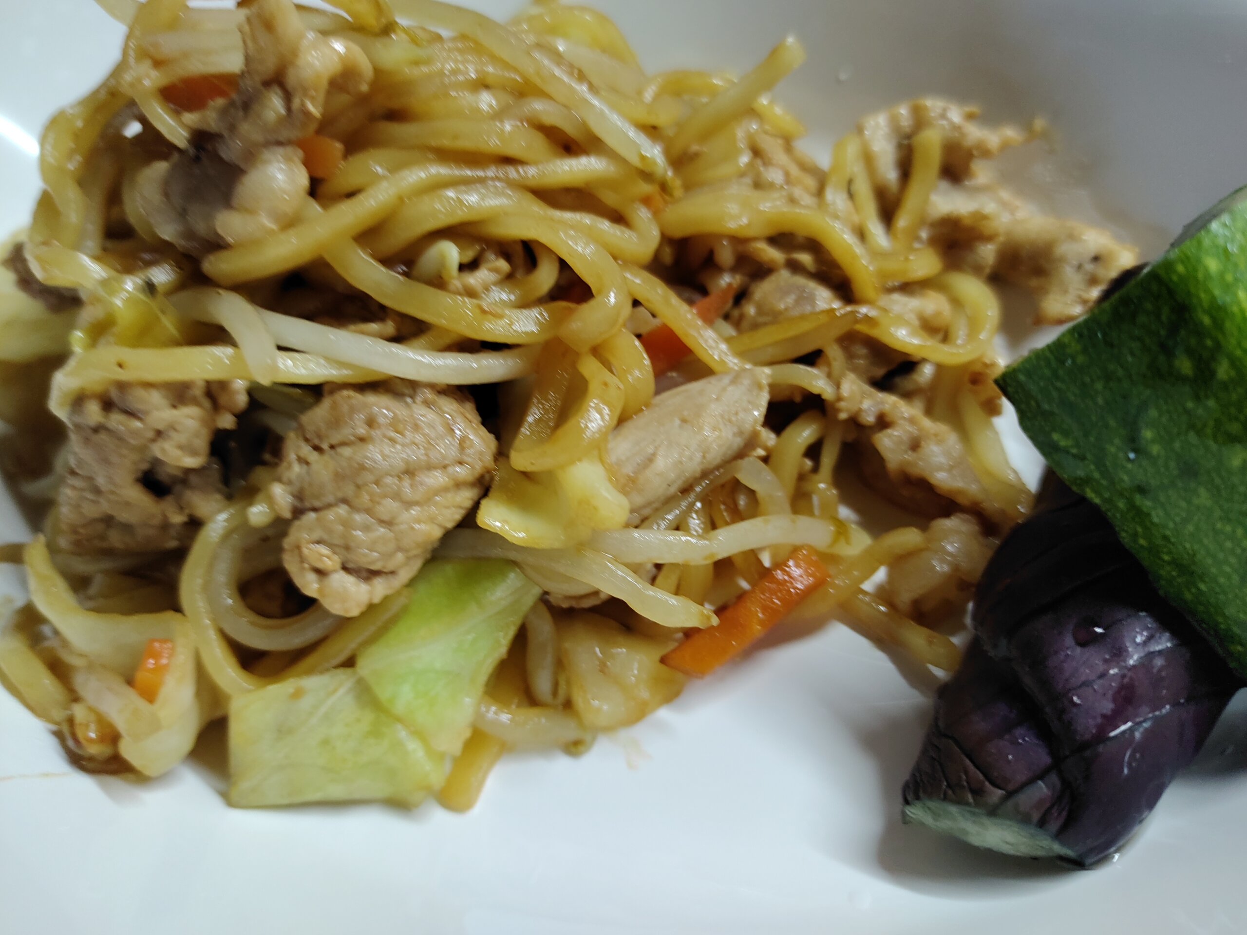 富士宮やヤキソバ。カット野菜+モヤシ袋と麺1玉、豚コマ小で作ると、ボリュームありすぎで食べきれないので、半分は冷凍。ナスとズッキーニの焼きびたし。