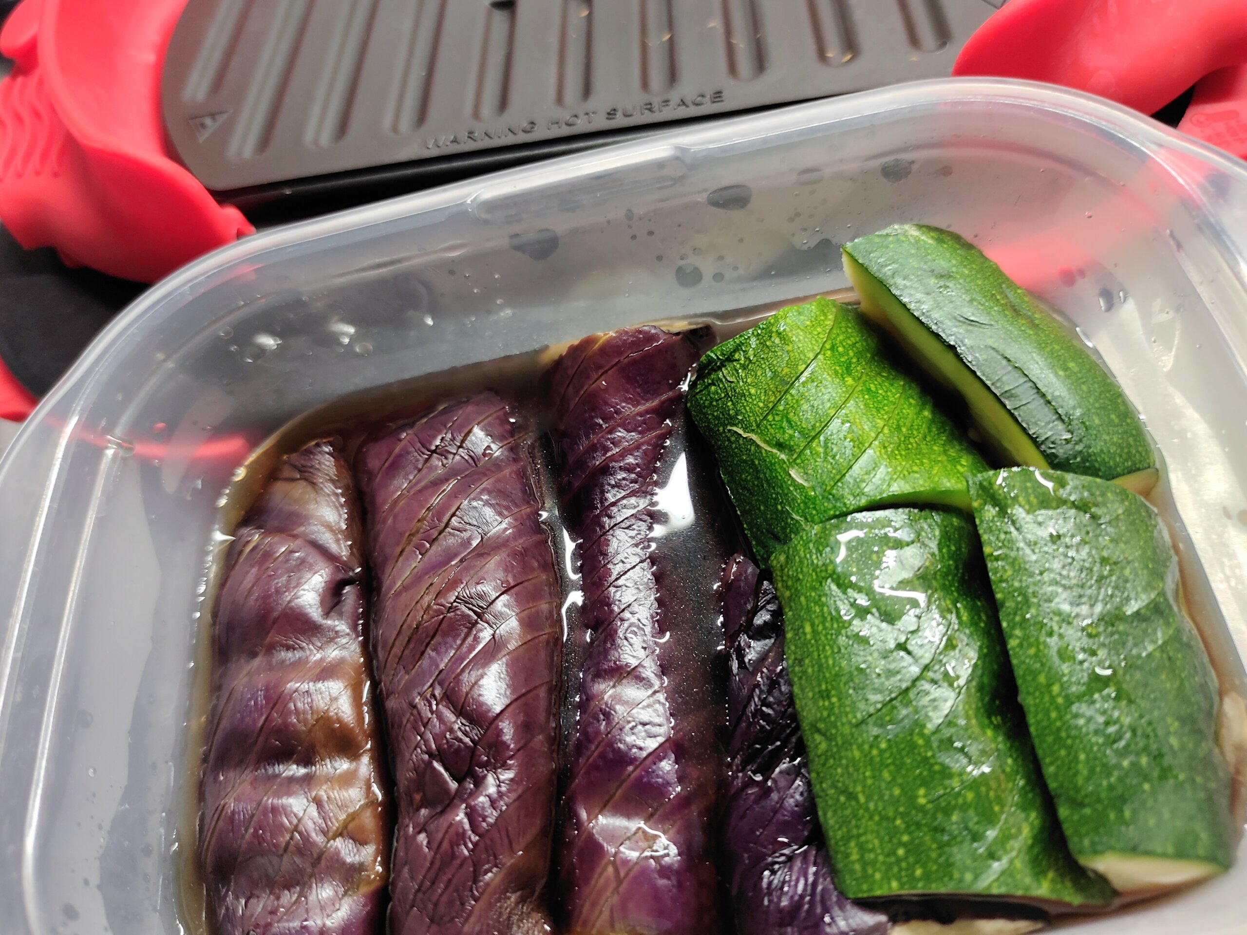 昼食の準備がてら調理、朝ホットサンドを作る電子レンジ調理器具で、ズッキーニとナスを焼いて、焼き浸しに。