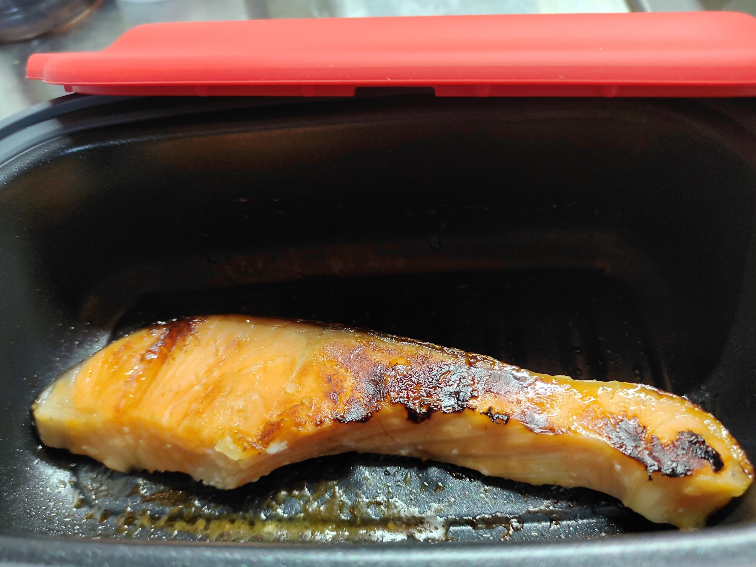 ホットサンドを作るはさむタイプのやつとちょっと深めでふたつきのやつ。で、ふたつきのは、焼き物なんかに使います。鮭とかね。お肉も焼けるよ。電子レンジで。