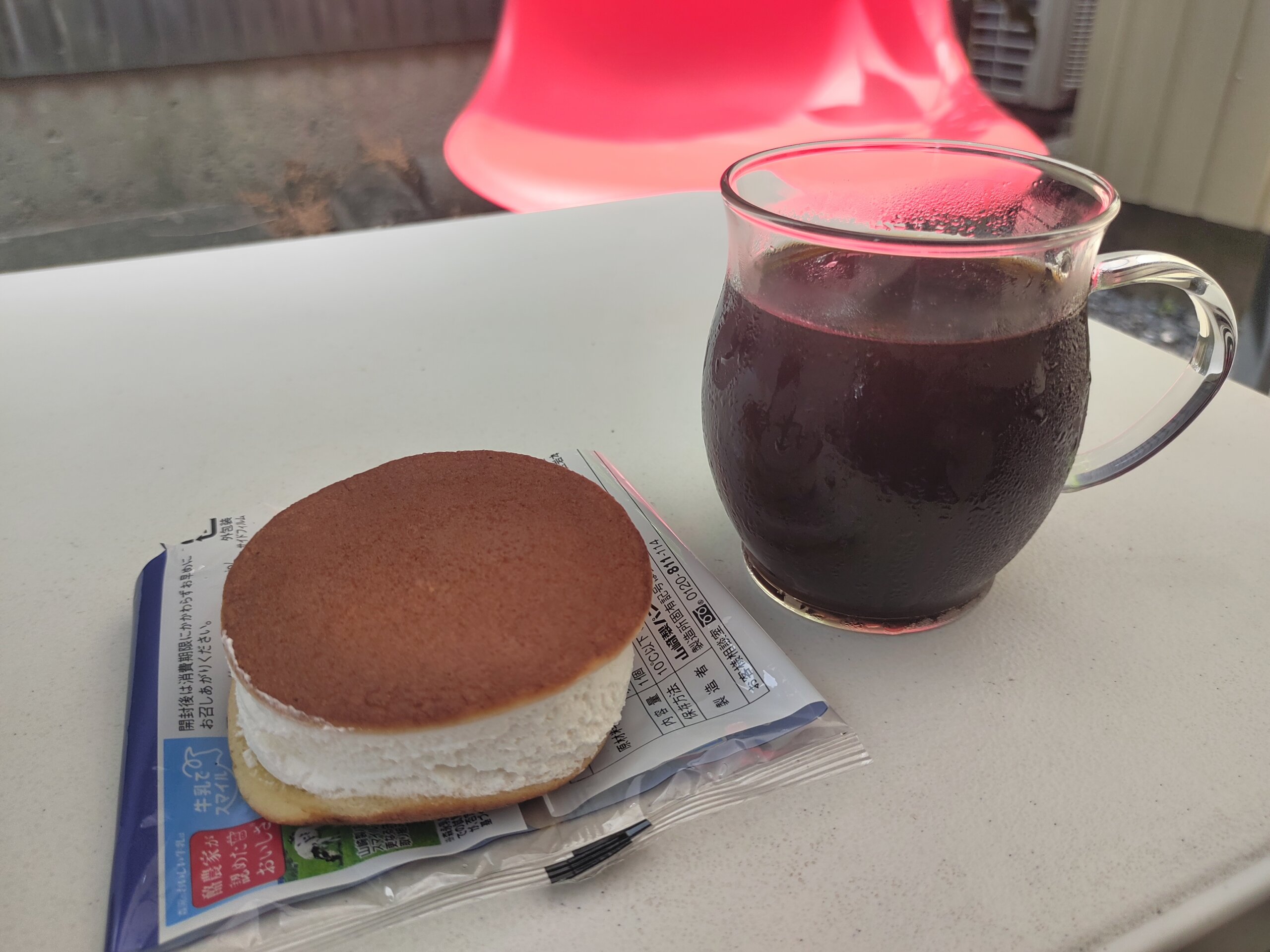 昼休み60分。食事が終わってスーパーへ行き、とうふとキムチのパックを買い、自宅へ運んで、アイスコーヒーとスーパーで買ったおやつで、まったりデザートタイム。