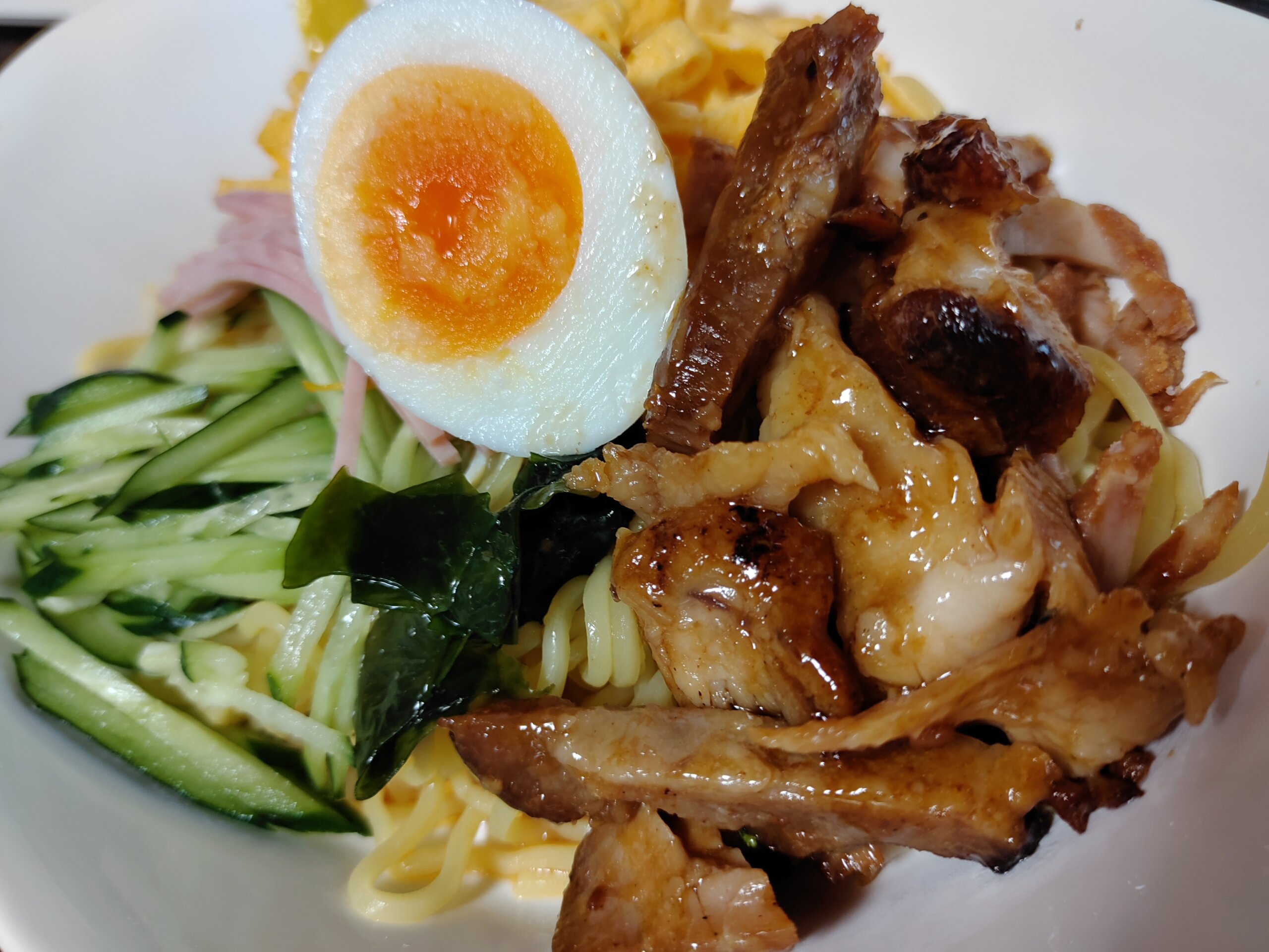 晩ごはんは、コープの冷やし中華に、タマゴ・キュウリ・肉屋のチャーシューをプラスして、おかず風。