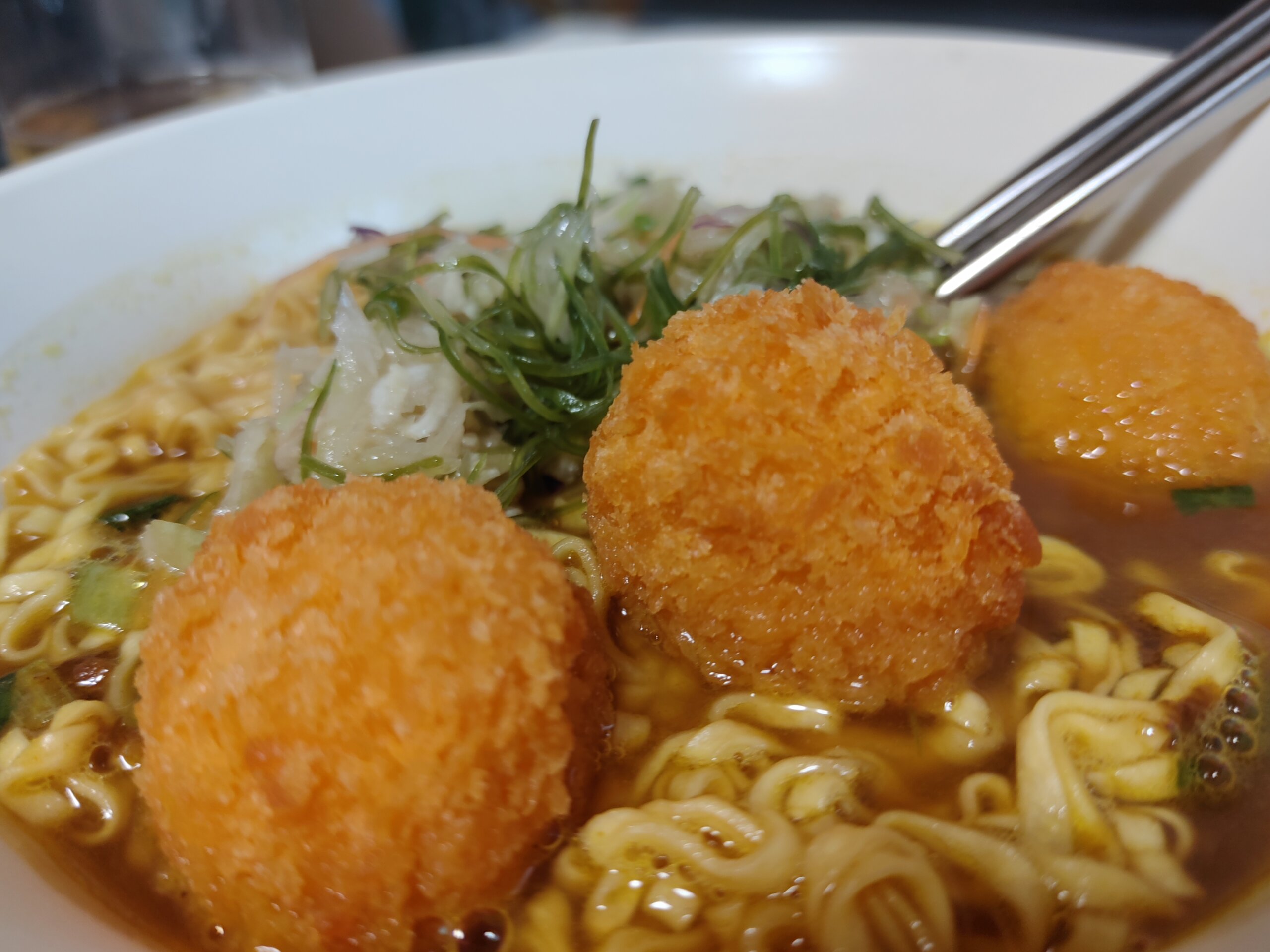 10時からヨガ、プール、帰宅して昼ごはん。カップヌードルカレー味に、せんぎりキャベツとサラダ昆布、うずらのフライのトッピング。