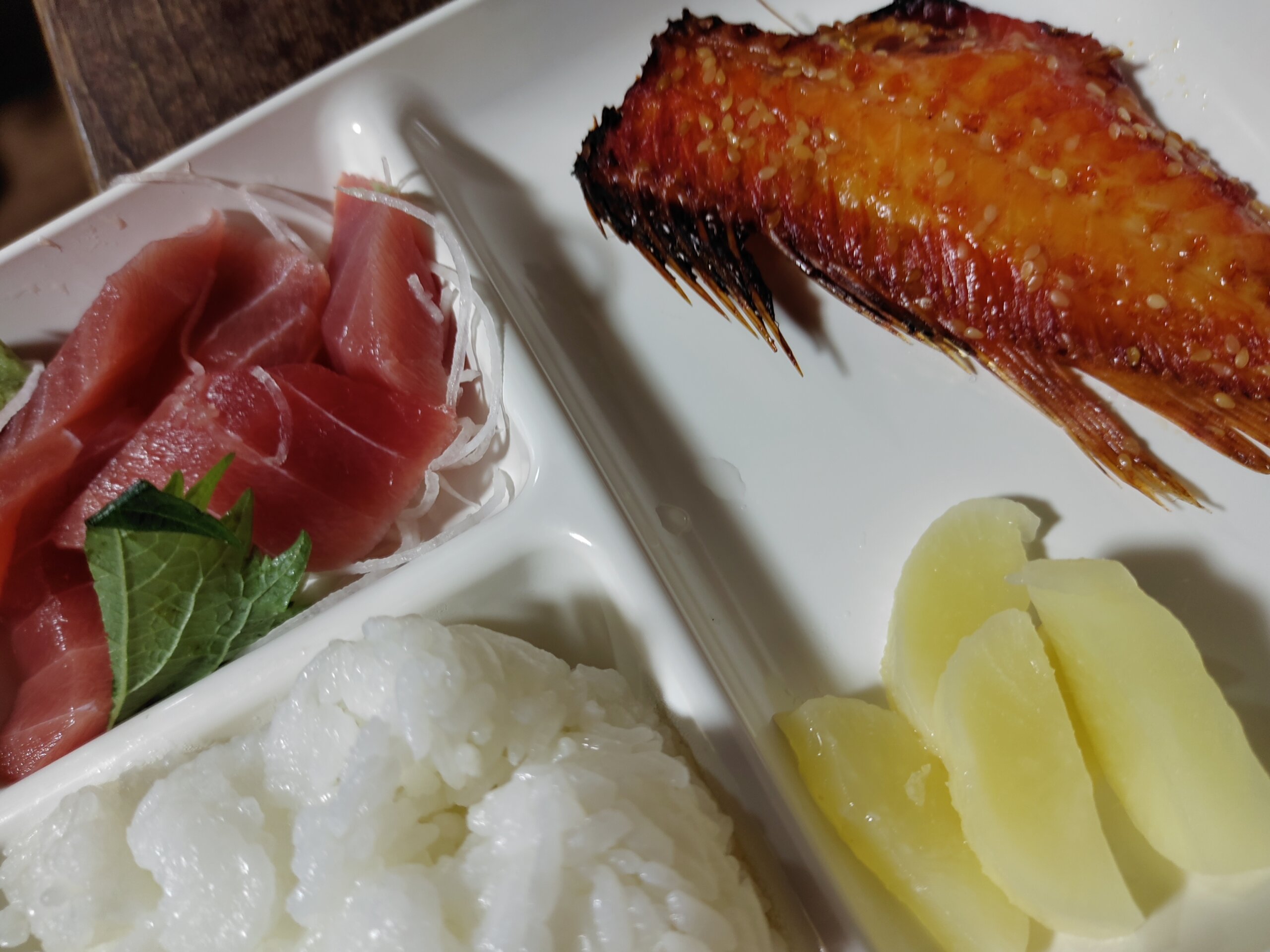 晩ごはんは、近所の魚武さんで買った、赤魚(110円)やお刺身、タクアンなど。と、トウモロコシ