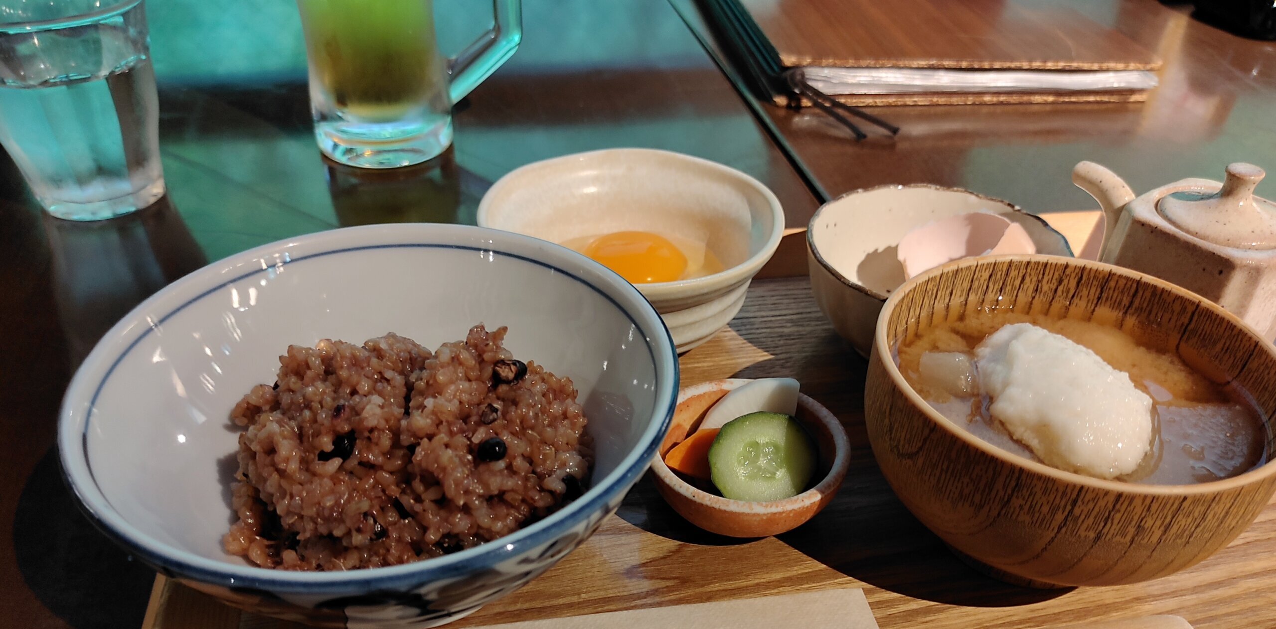 夕方ここにきたら、晩ごはんは、寝かせ玄米(アンコメさんち)の、タマゴかけごはん。473円。
