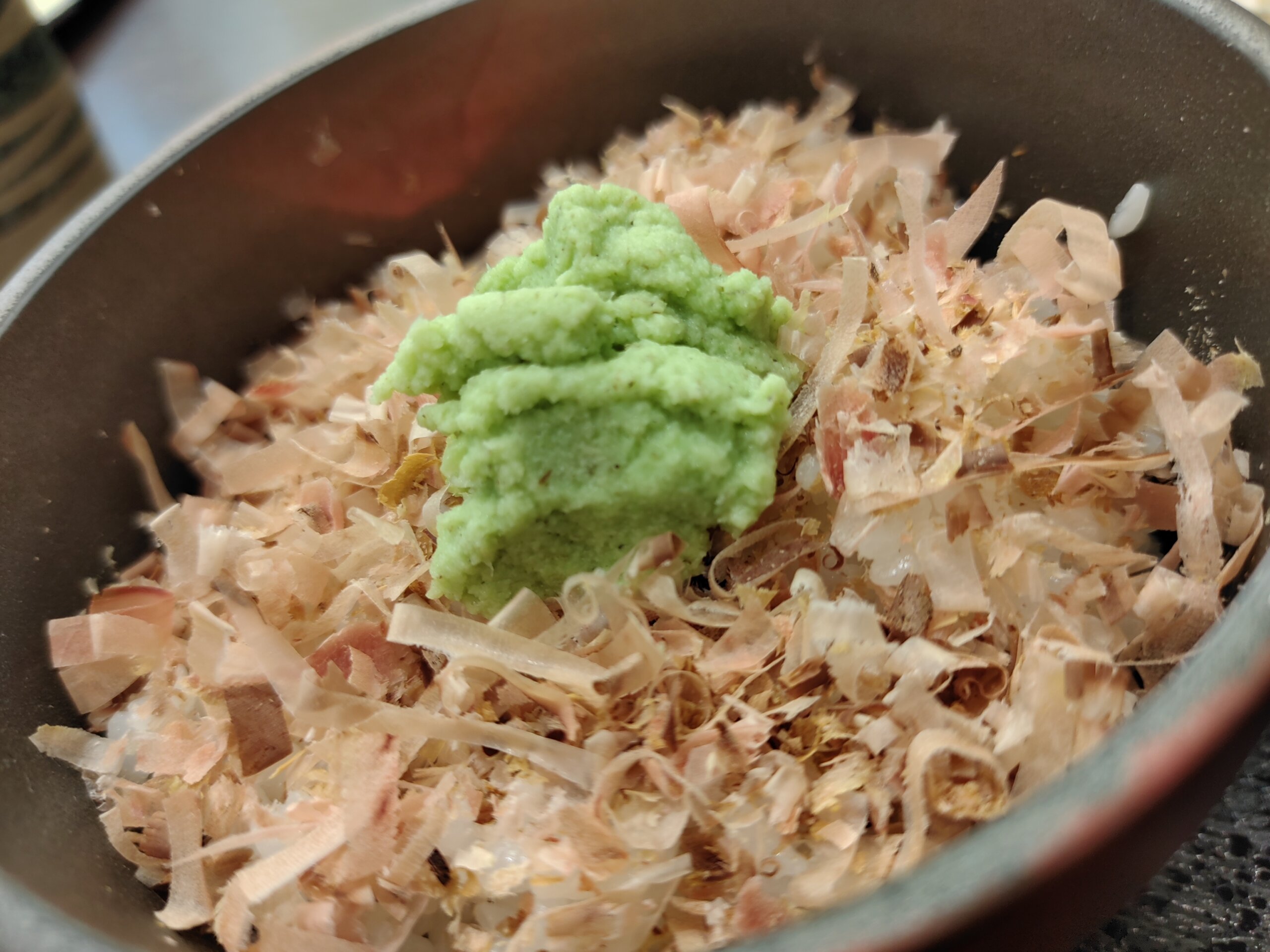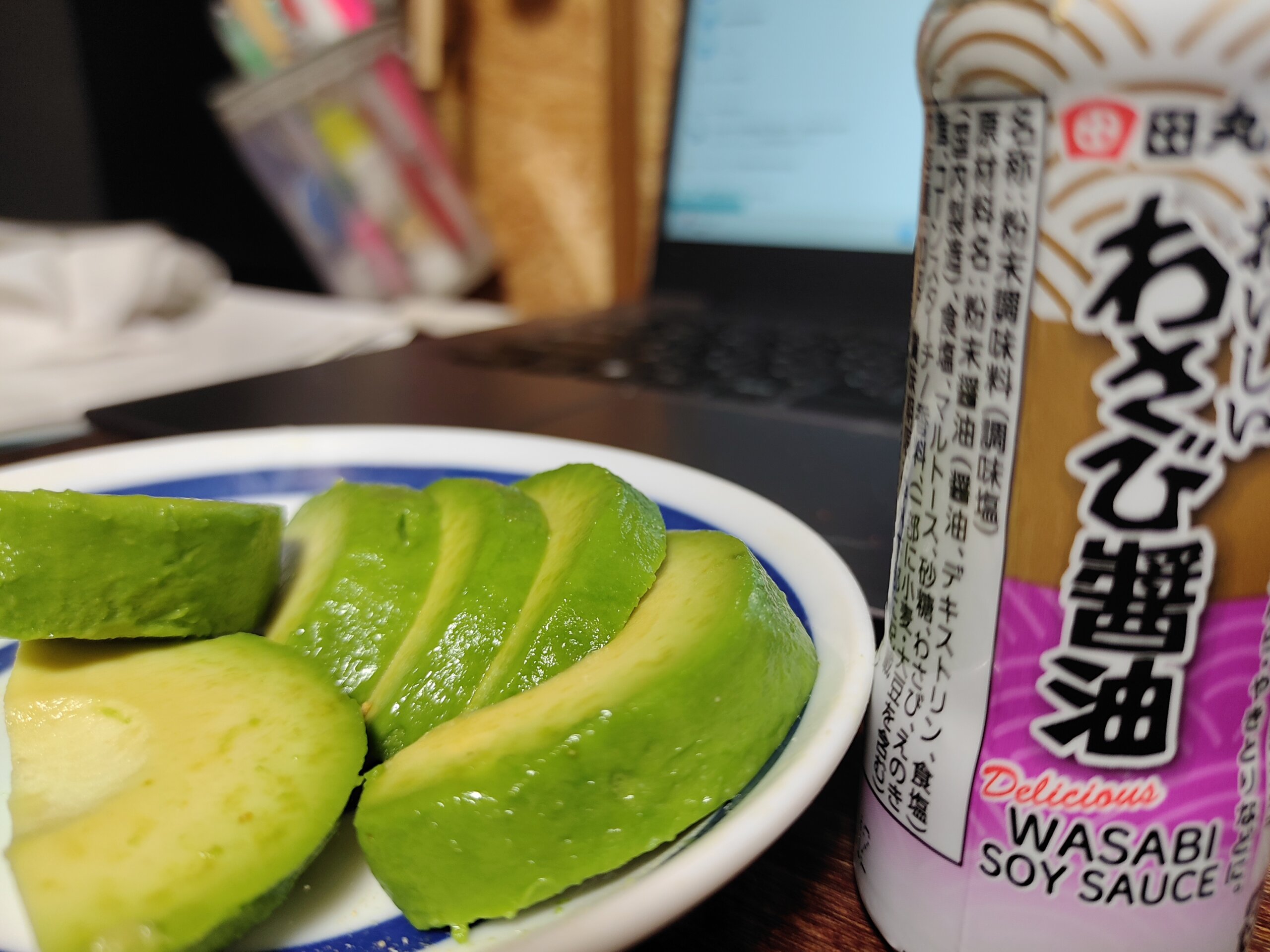 田丸屋さんで買った、粉末わさび醤油をアボカドに振りかけて食べたらめちゃうま~。