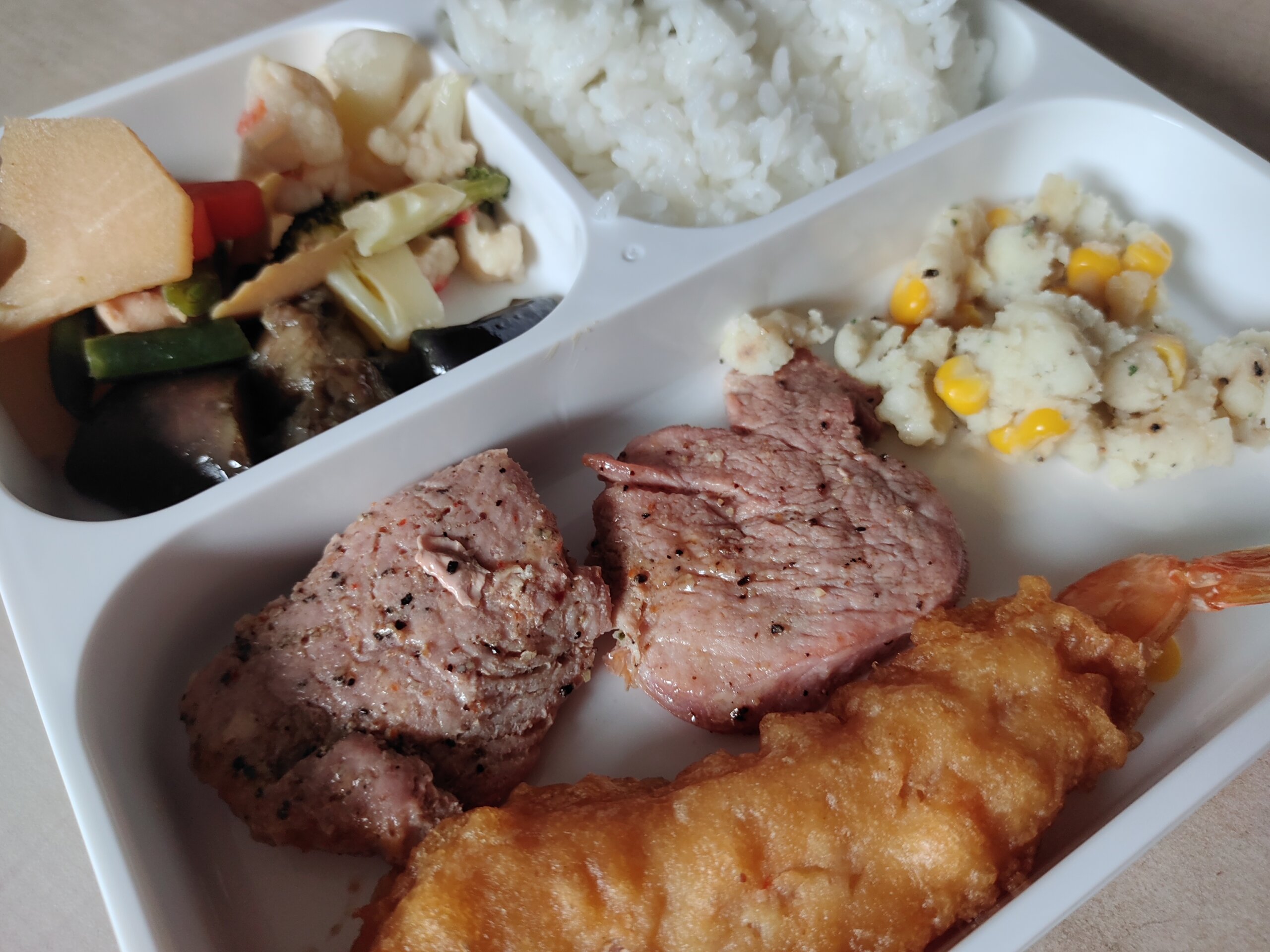 まずは、昼ごはん。「チキンカツ・ミニハンバーグ・タコライス風ソテー」を食す。