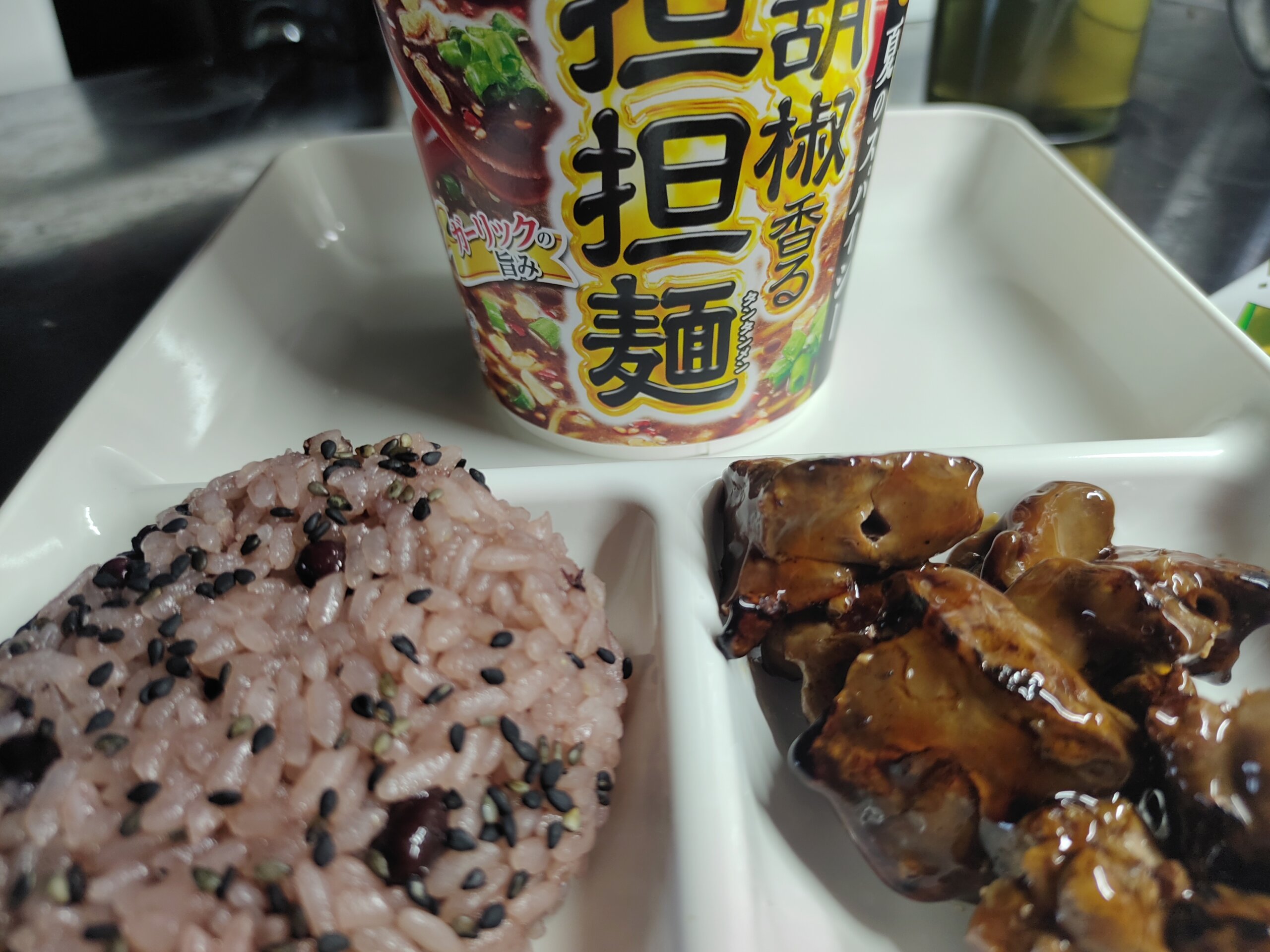 昼ごはんは、カップ麺と、鶏レバーと、おこわおむすび