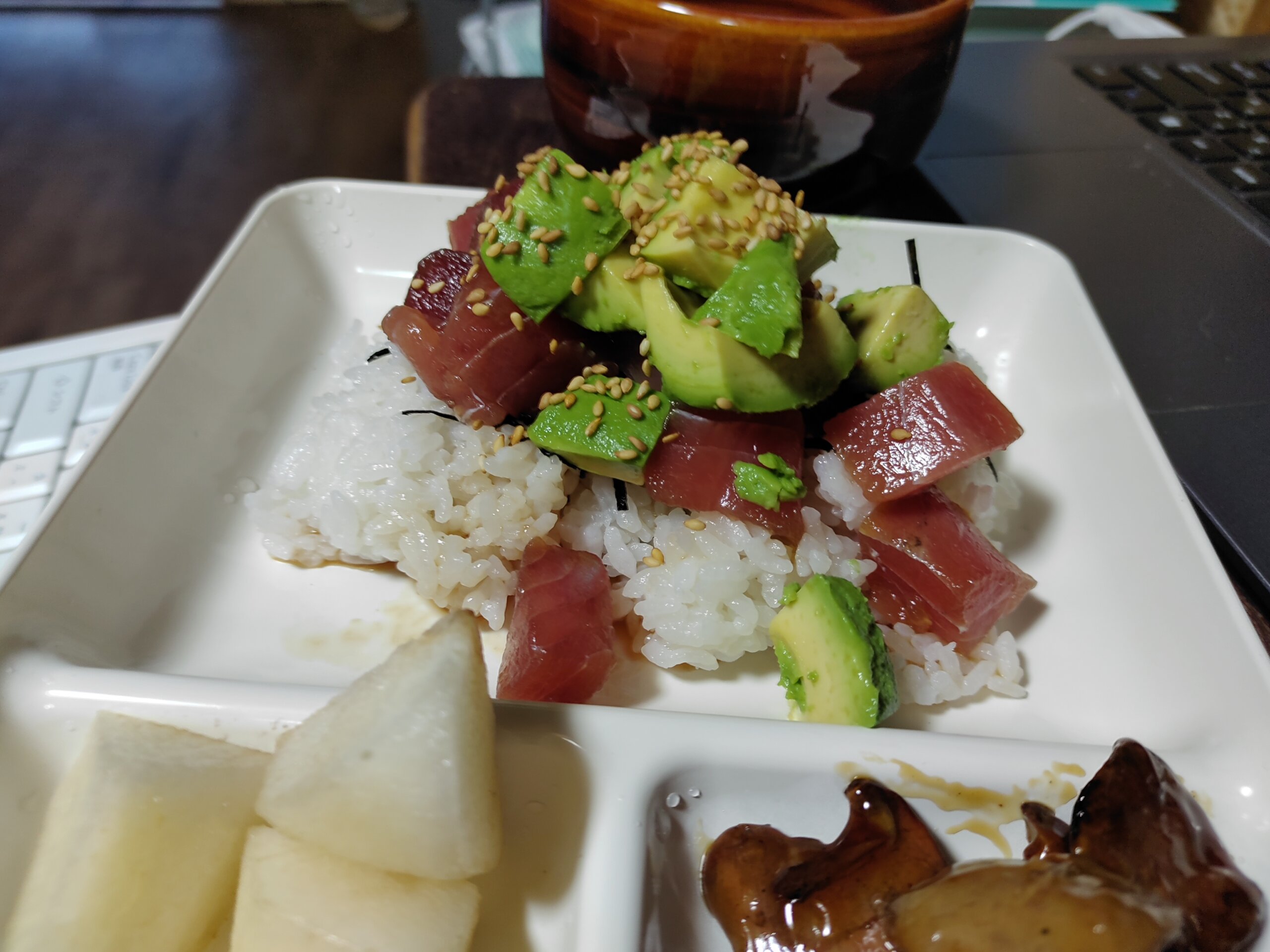 晩ごはんは、中トロのヅケと、アボガドのお丼。昼の残りの鶏レバー、梨。赤ワインを1杯。