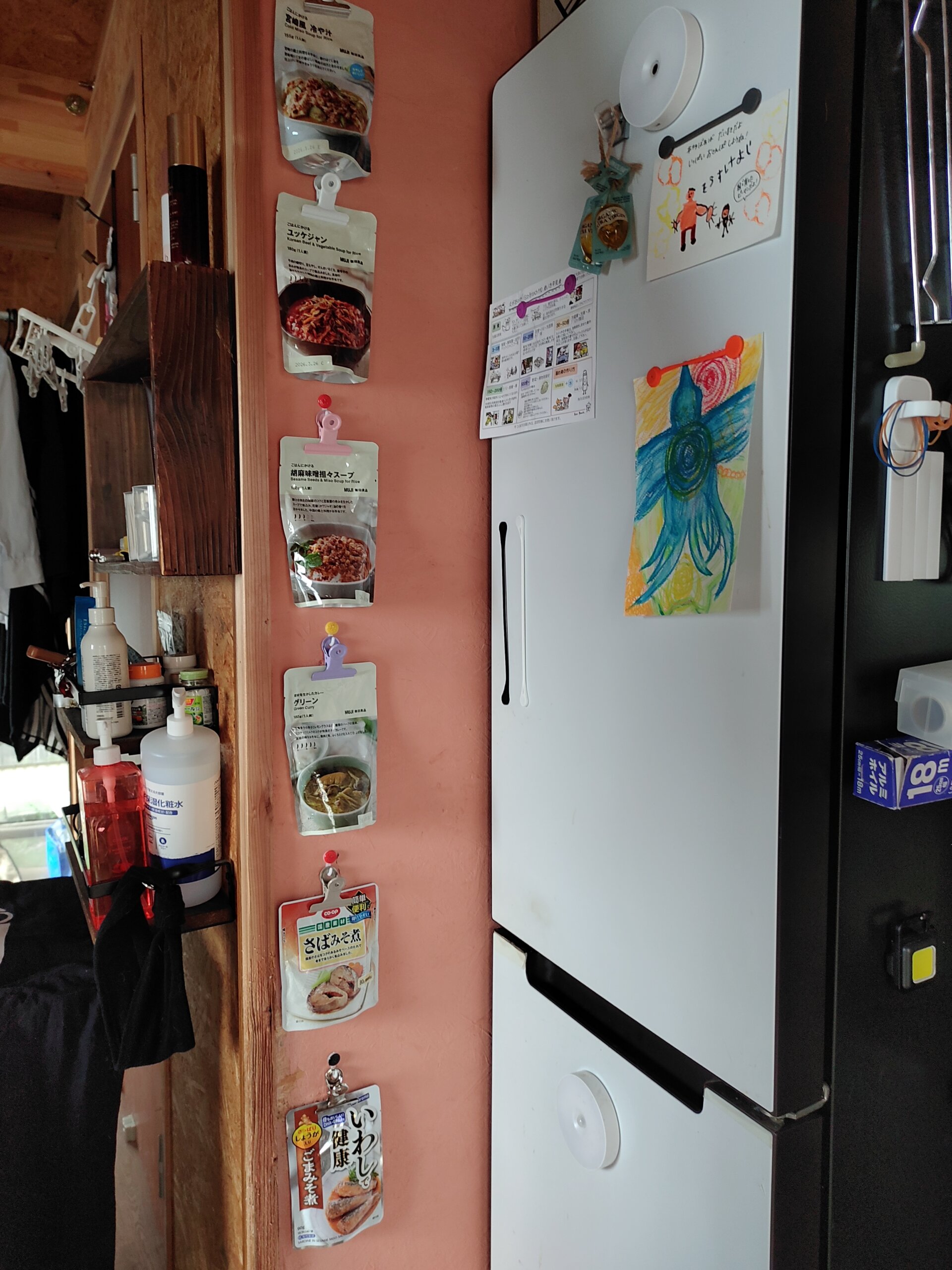 タクシー乗務後、A社お休みなので、11時ころからフリー。プール・お風呂のあと帰宅して、ちょっとDIYっていうか、冷蔵庫の脇に、レトルト食品をディスプレイ&ストックするようにしてみた。