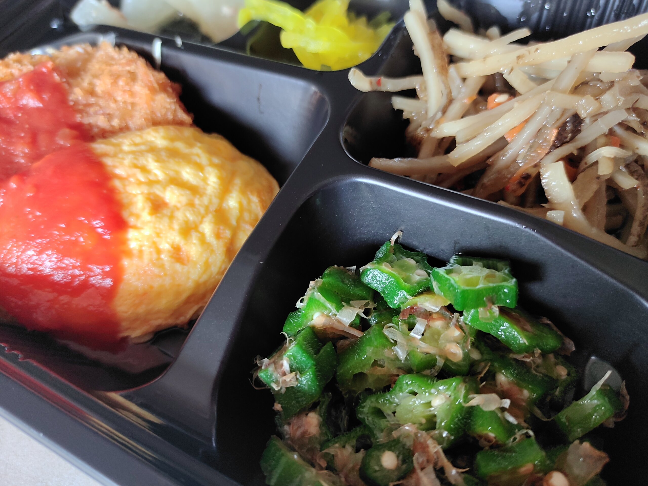 昼ごはんは、しずおか給食のお弁当。やっぱり、お弁当頼んだほうが、いろいろな食材が食べられて便利・・・。好物のオクラも、ひとパック買ってきちゃうと、大量にできちゃうけれど、お弁当なら・・・・。