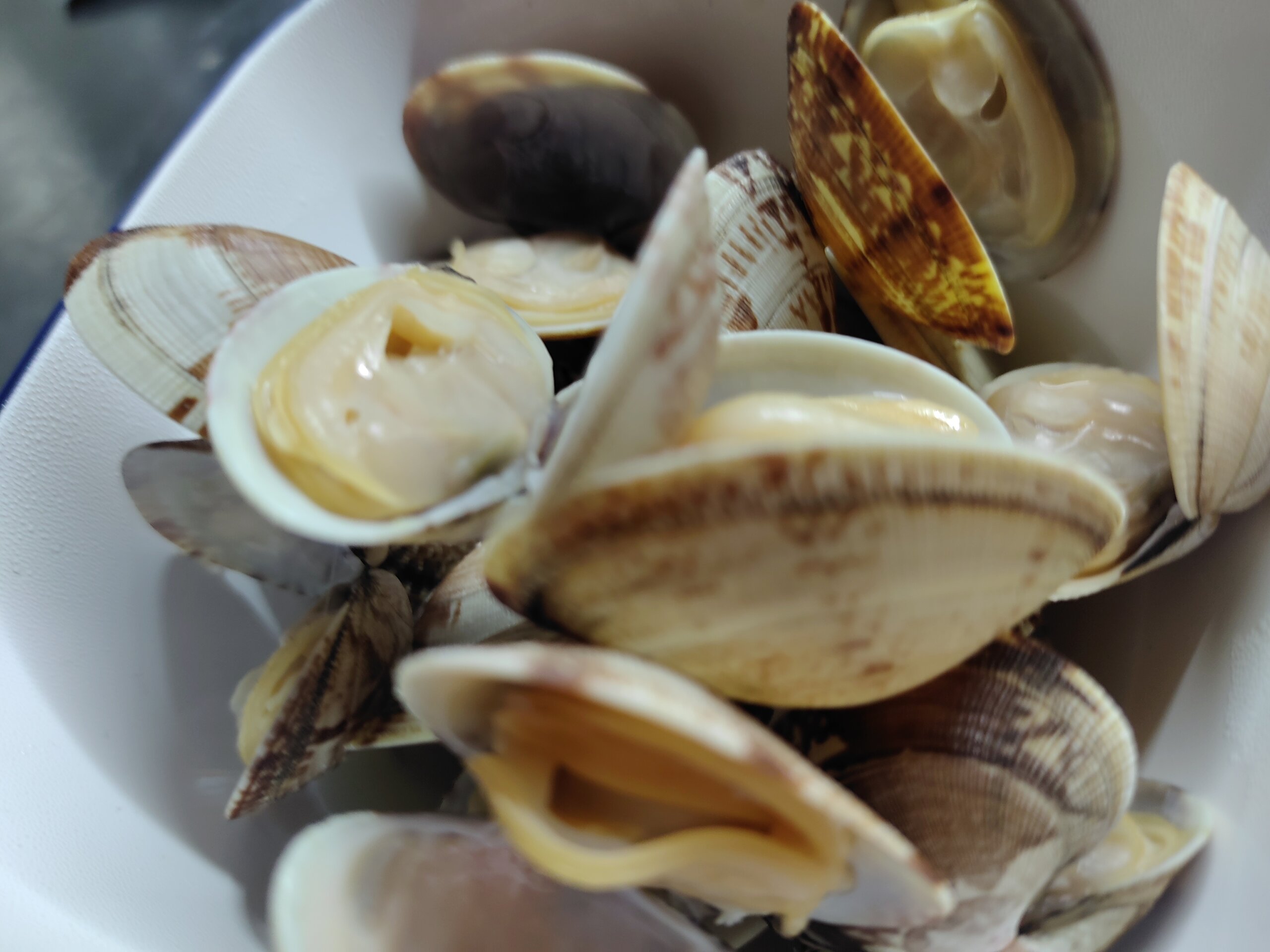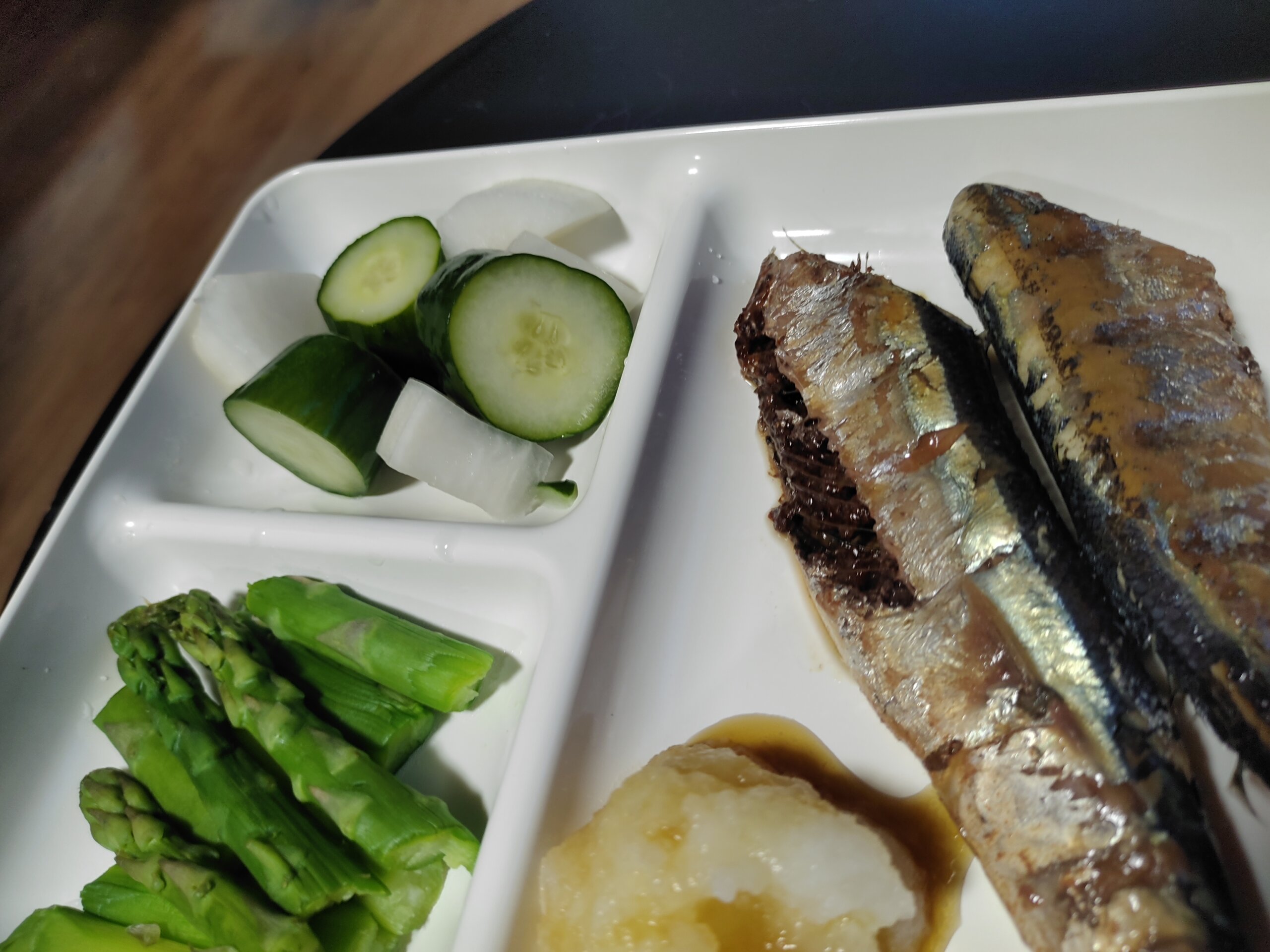 新ものサンマと、アスパラ(タルタルソース)、つけもの。アサリの酒蒸し。