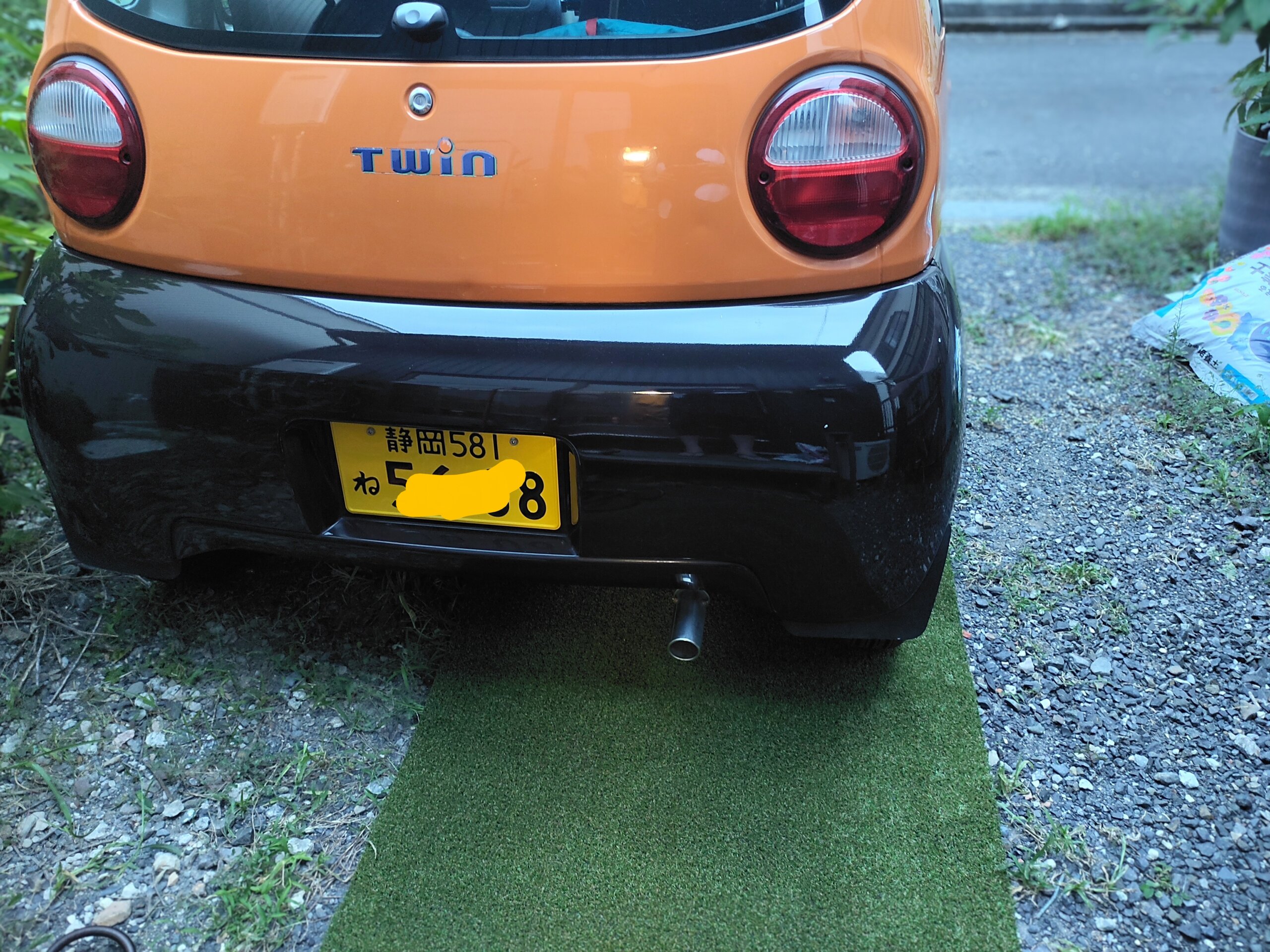 雑草よけと、駐車スペースの目印的に、置いてみた。クルマで、バックするときの目印・めやすのつもり。何度か試してみたけれど、いい感じに停められて、よいかなぁ・・です。