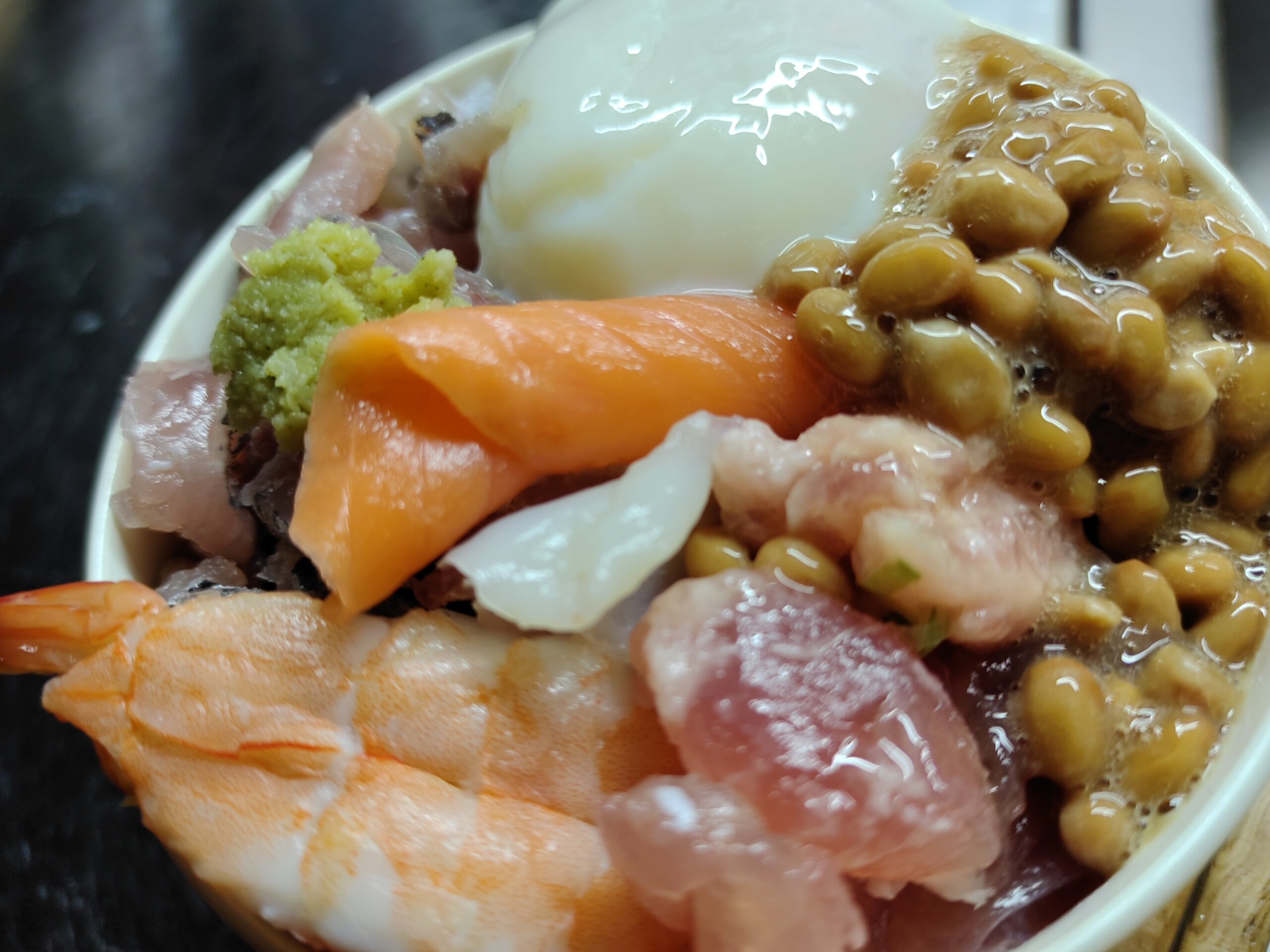 彩り海鮮丼297円に、あじたたきお刺身297円をプラスして、そのうえ、納豆と温泉卵もプラスした、豪華海鮮丼と、サラダ昆布入りお味噌汁。