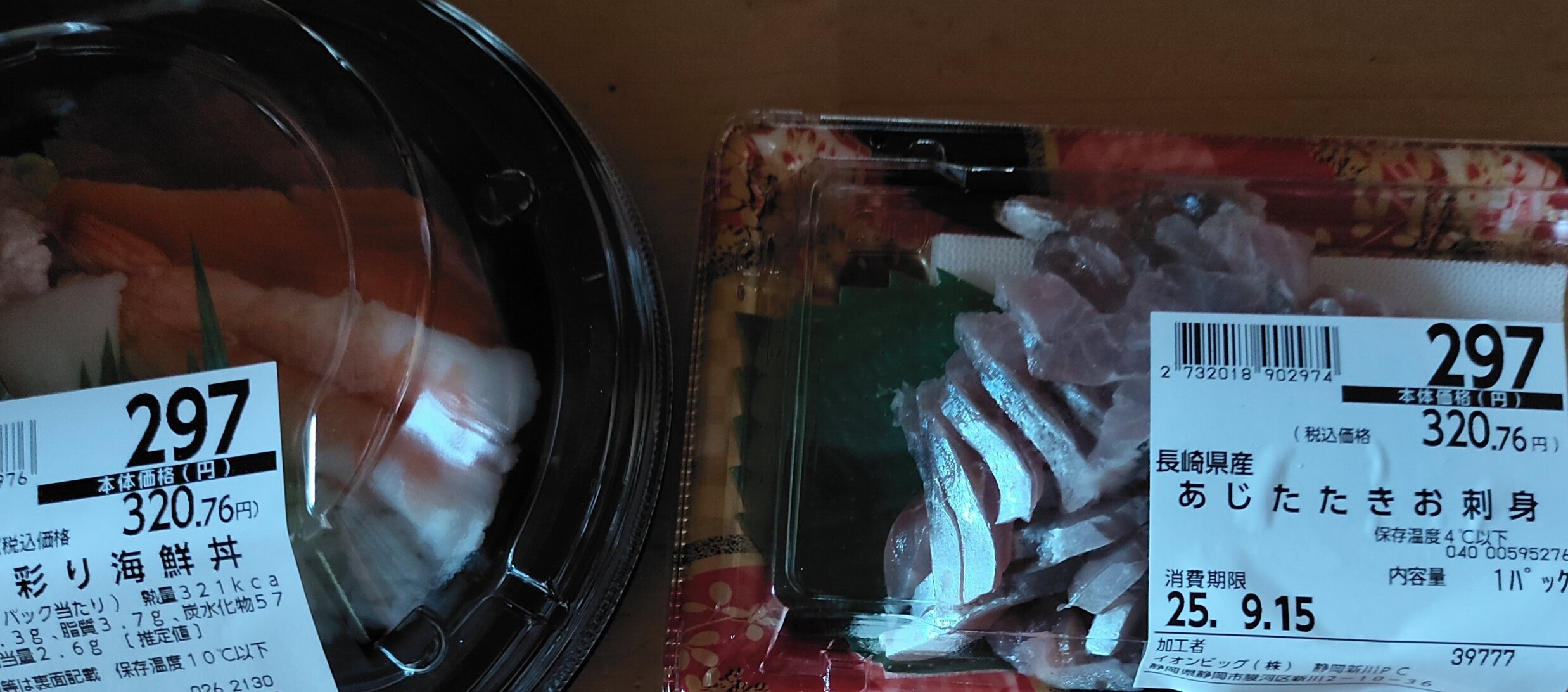 彩り海鮮丼297円に、あじたたきお刺身297円をプラスして、そのうえ、納豆と温泉卵もプラスした、豪華海鮮丼と、サラダ昆布入りお味噌汁。