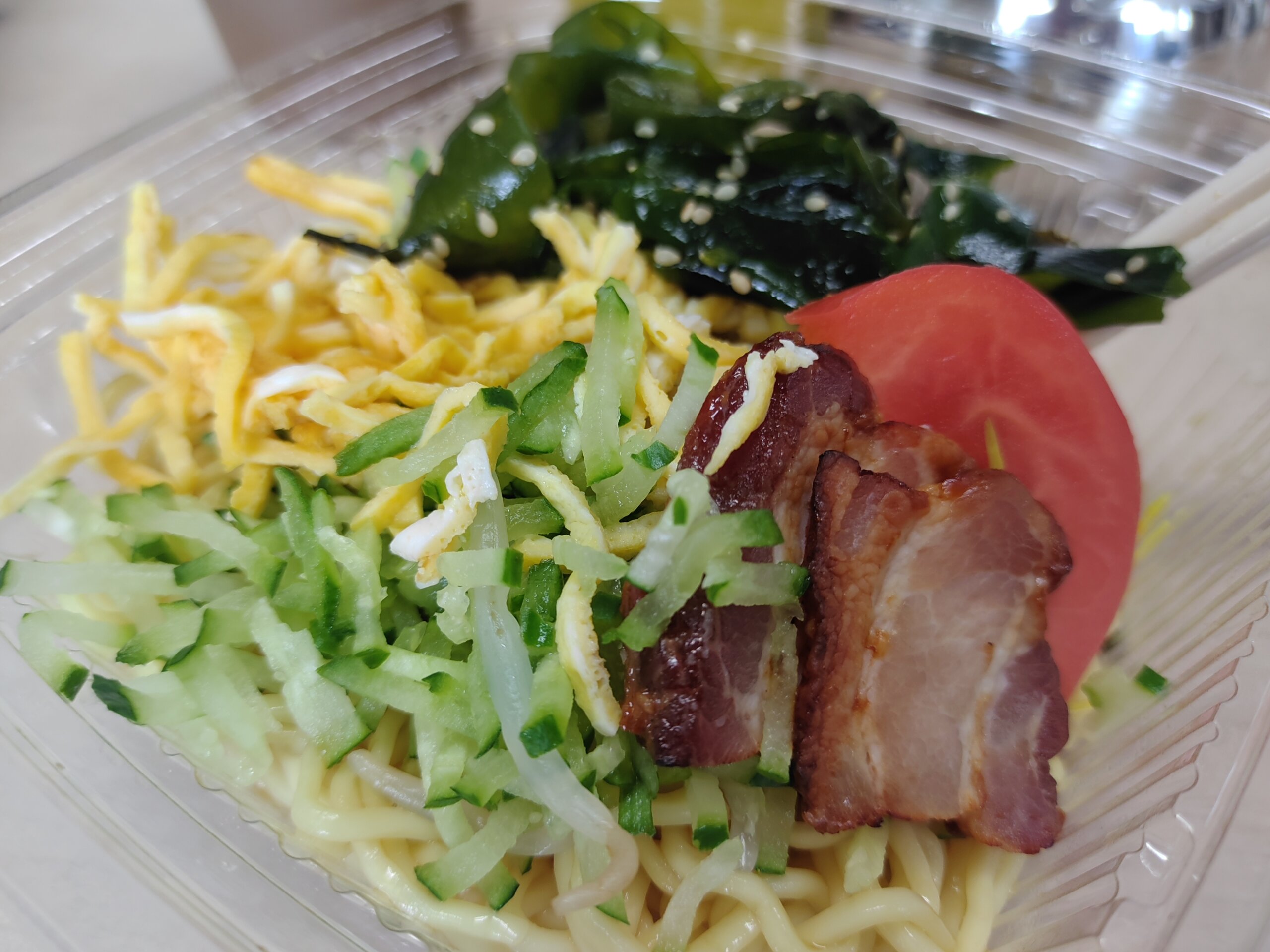 朝ごはんは、豊月堂のハムサンド。でも・・・・4時前に食べたから9時前にはお腹すいてしまった。。まあ、お昼までがまんして、昼ごはんは、しずおか給食のお弁当だけど、きょうは、冷やしラーメン