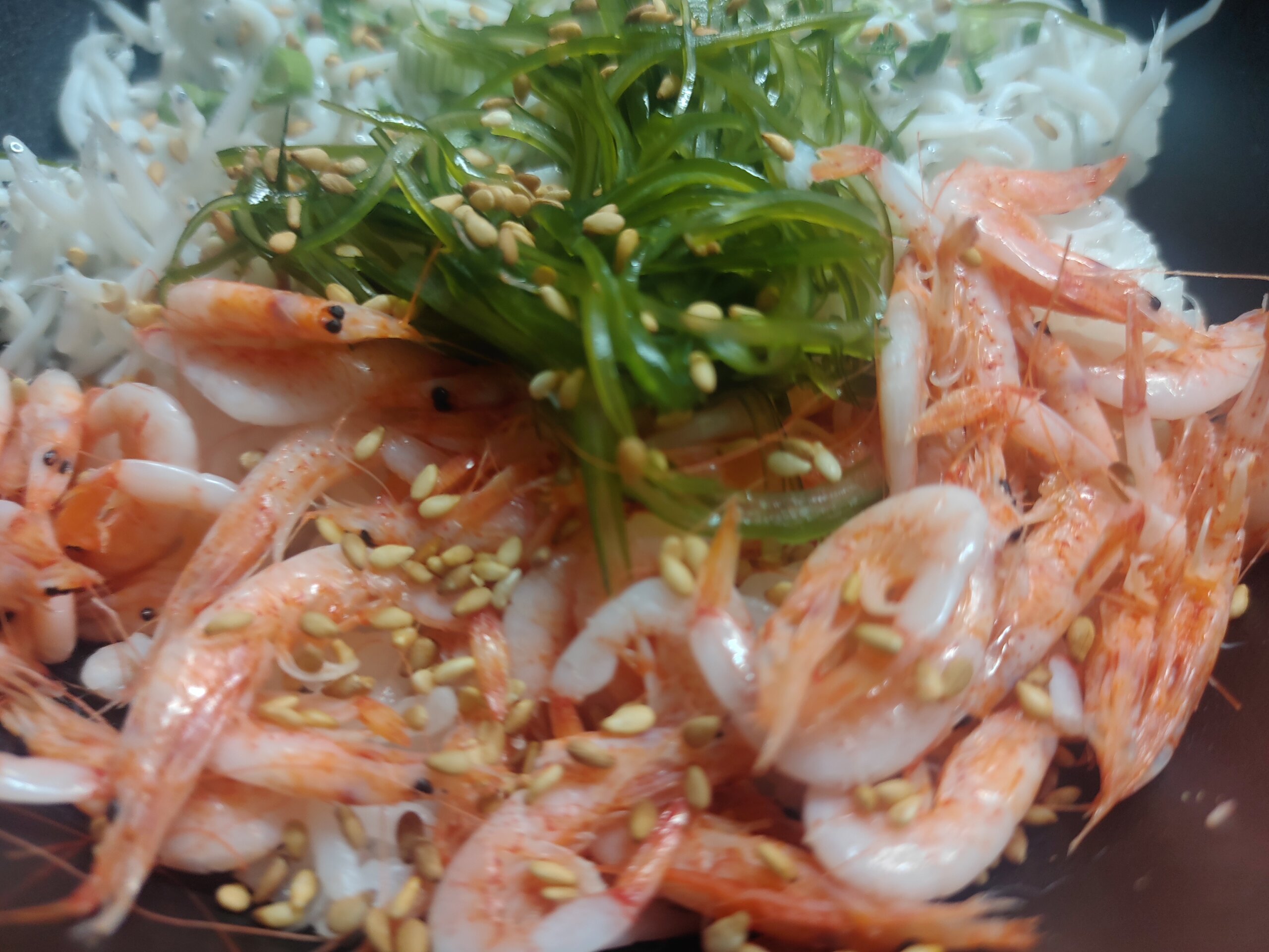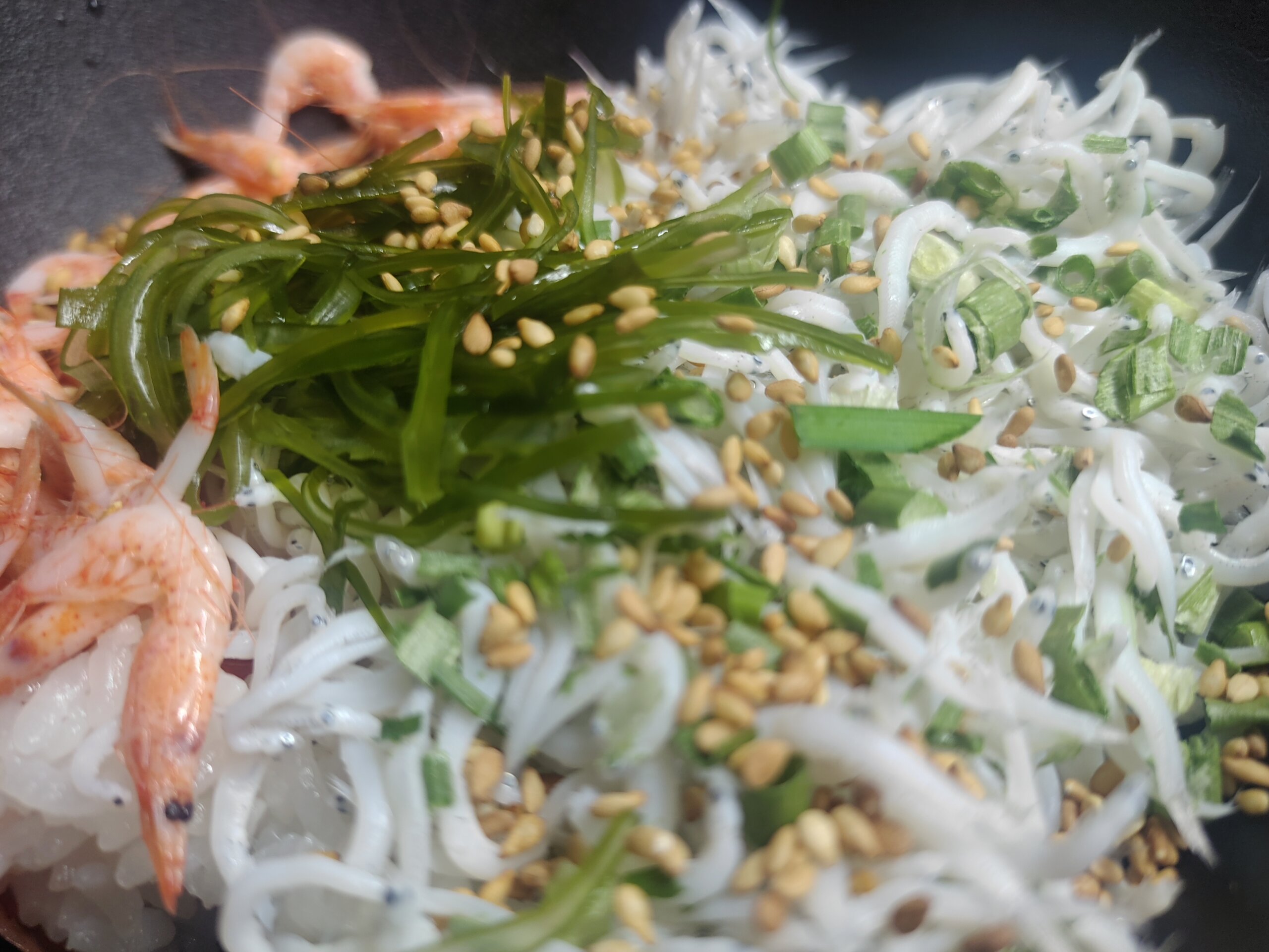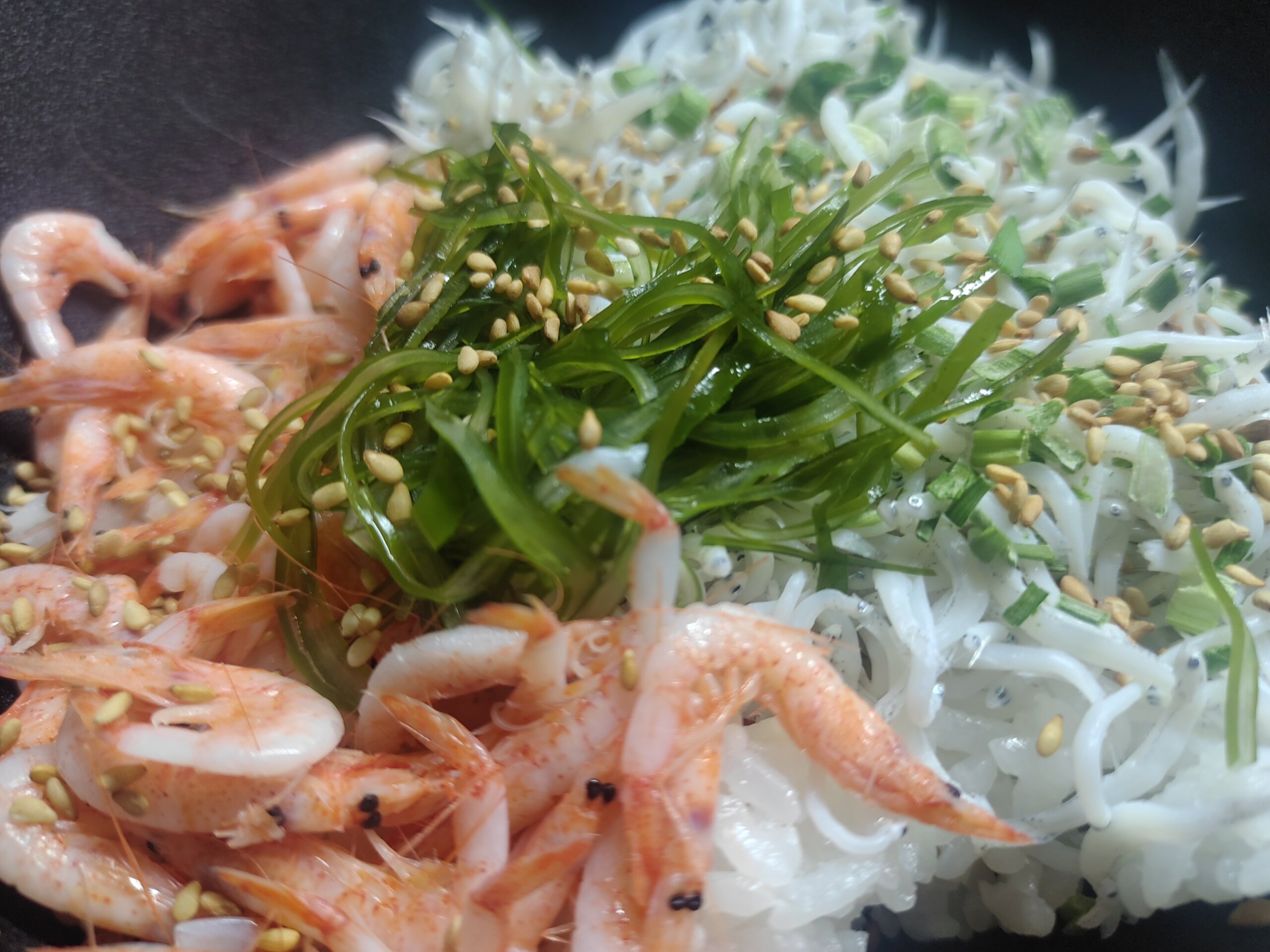 朝ごはんは、昨日買った、シラス+桜海老+次郎長屋さんのサラダ昆布のお丼。