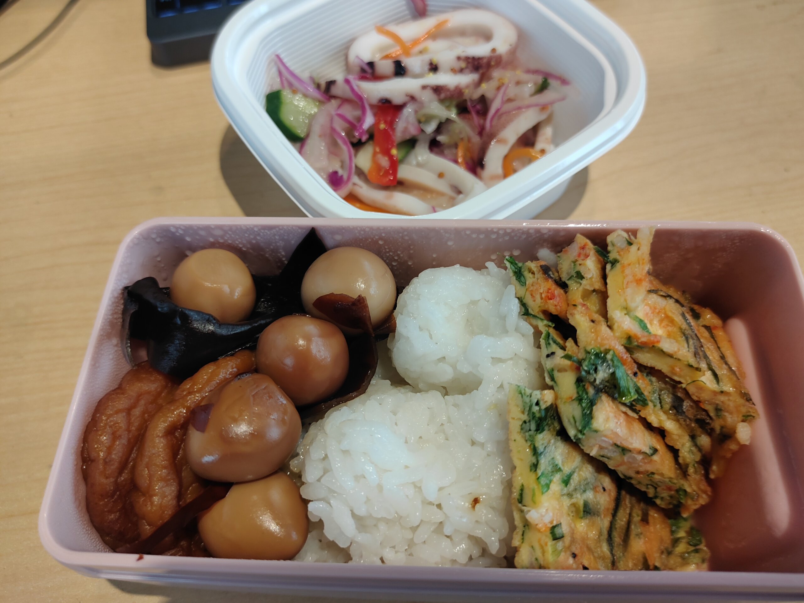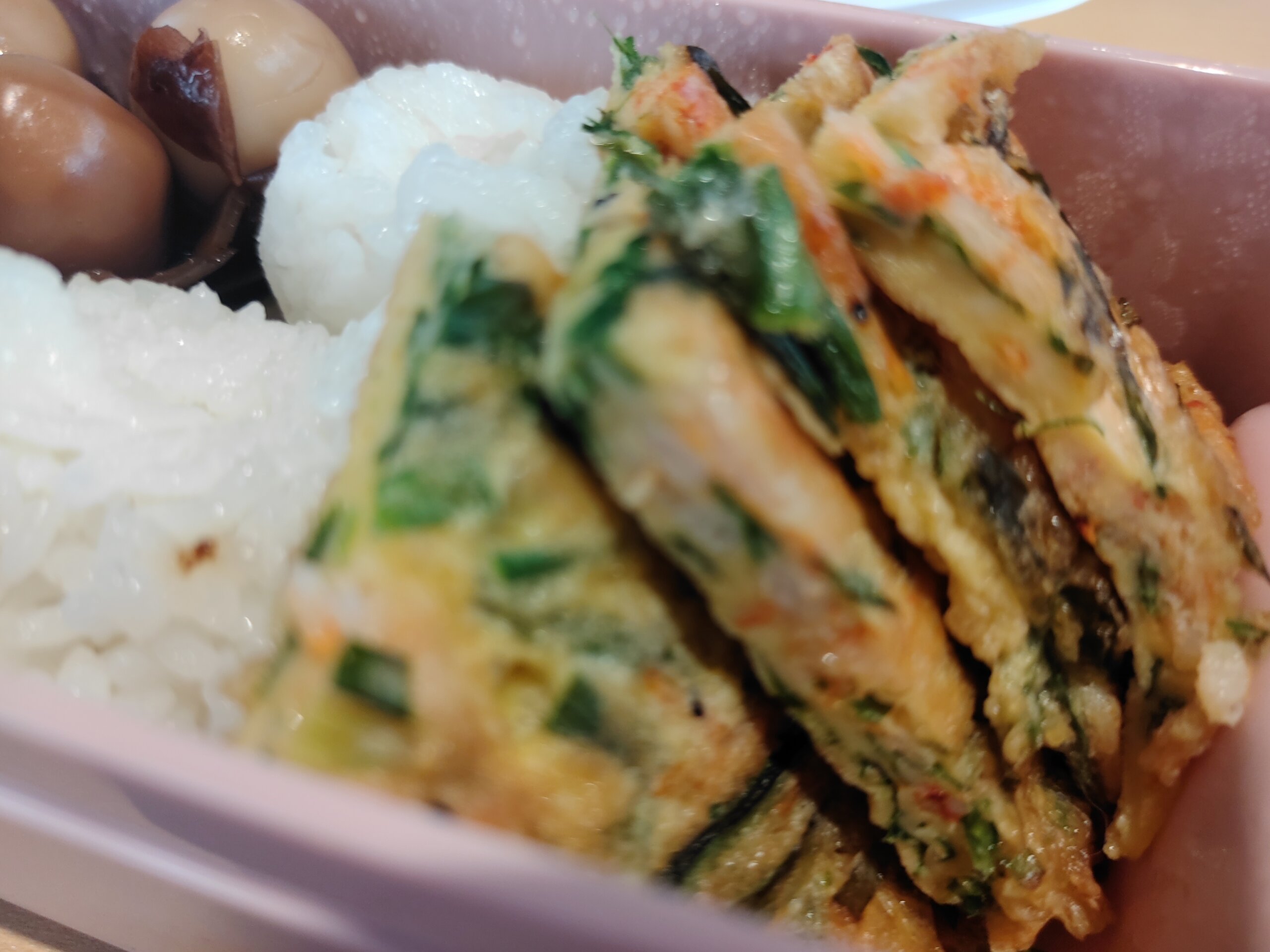 桜海老と庭のニラで、チジミ。昆布とウズラの卵、練り物の煮物がまだあるんだなぁ。自炊するとこうなる・・・