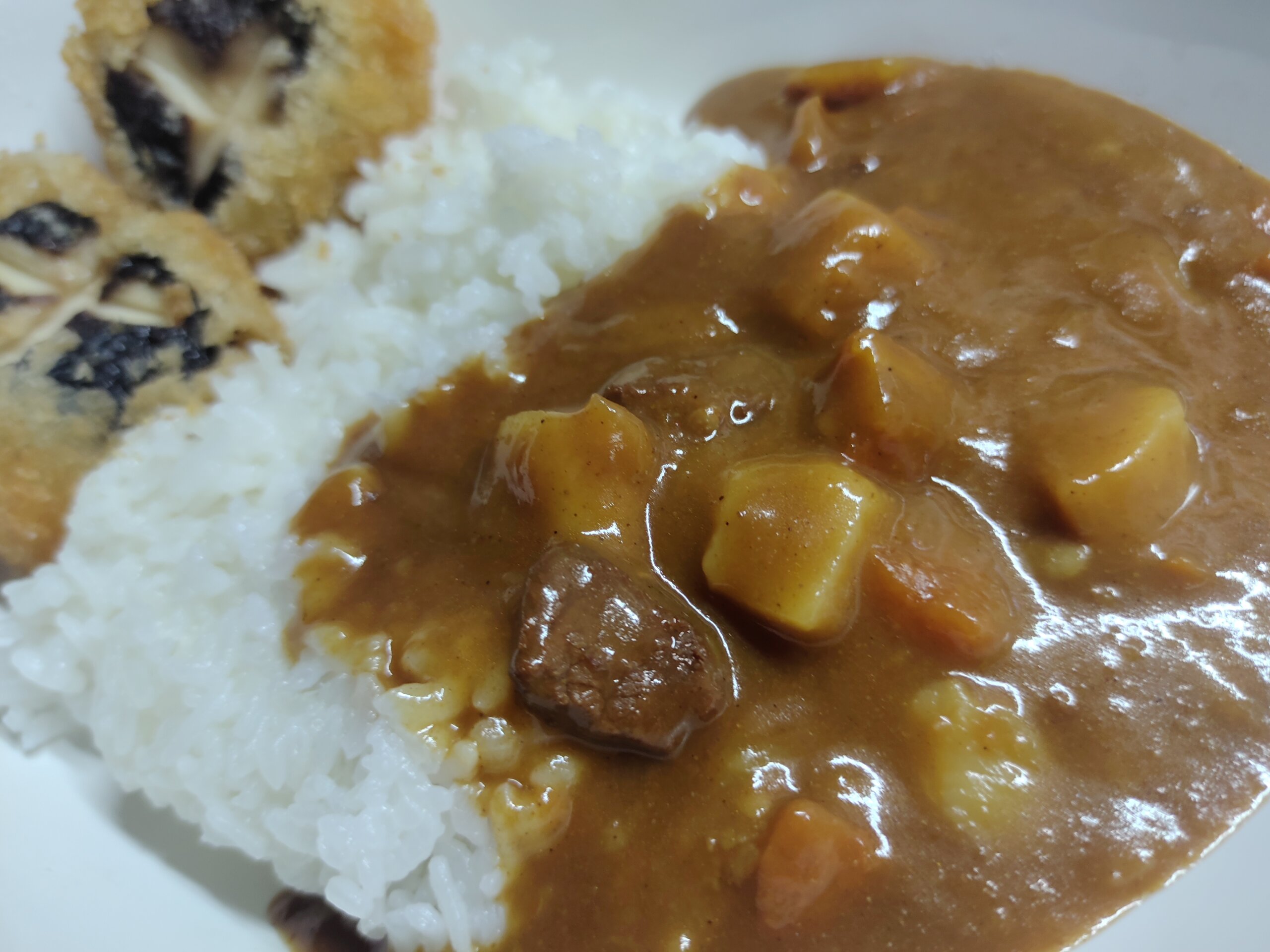 晩ごはんは、コープのレトルトビーフカレーと椎茸の肉詰めフライ