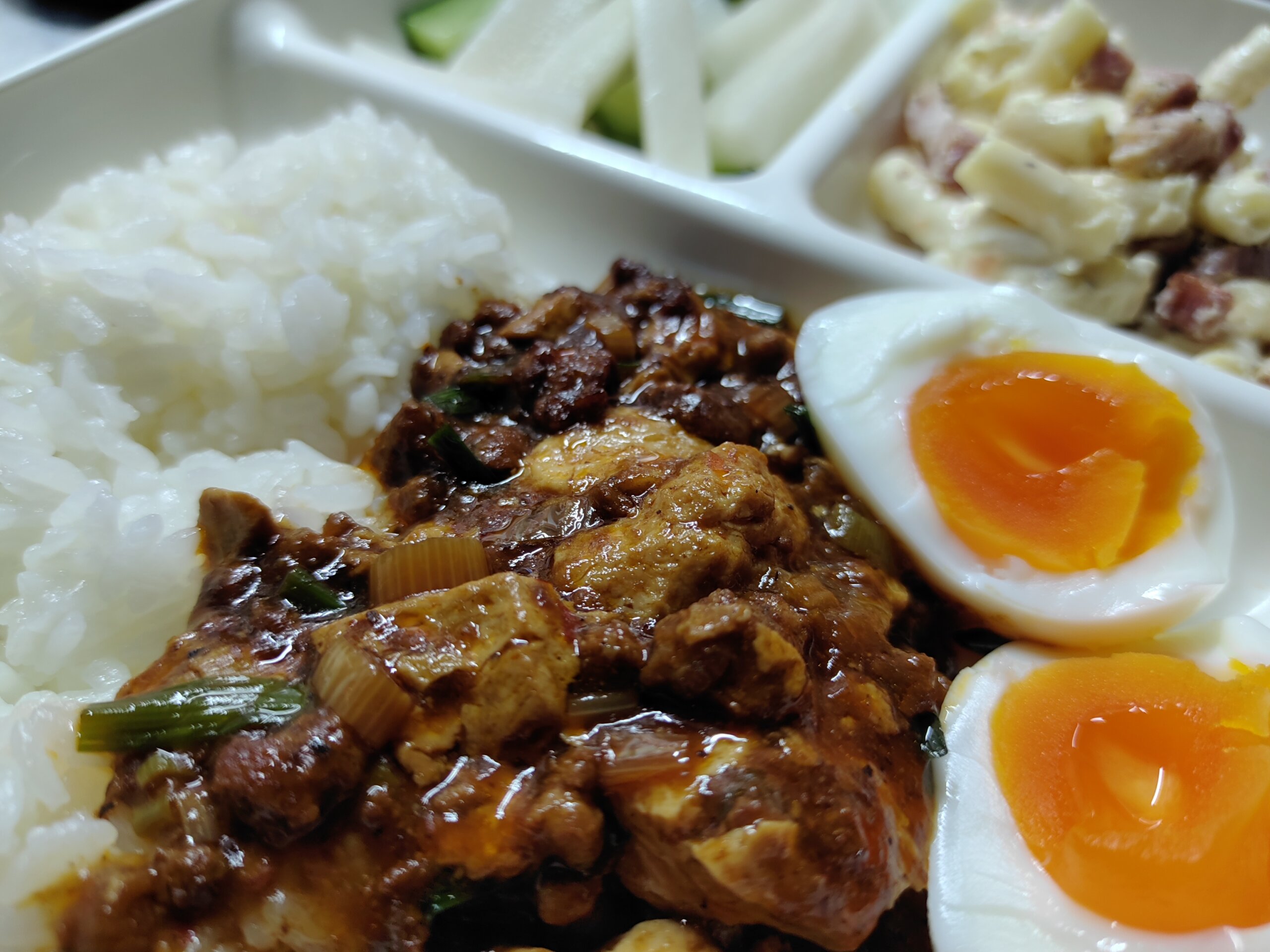 ということで、晩ごはんは、麻婆豆腐丼(昼間のしずおか給食のお弁当の半分ごはん・華音のまかない)と、キュウリ・大根の浅漬け、マカロニサラダ、卵。