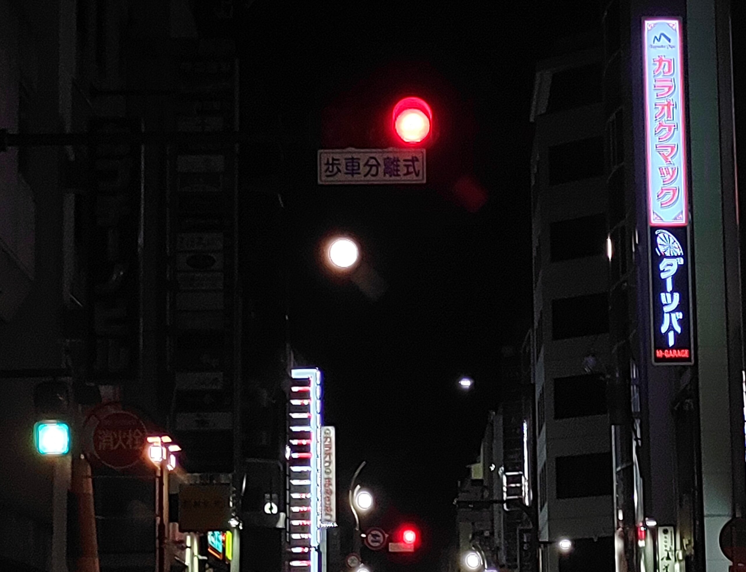 その月が、繁華街の赤信号と並んでいて、思わずタクシーの運転席から撮影した、赤信号とお月さま