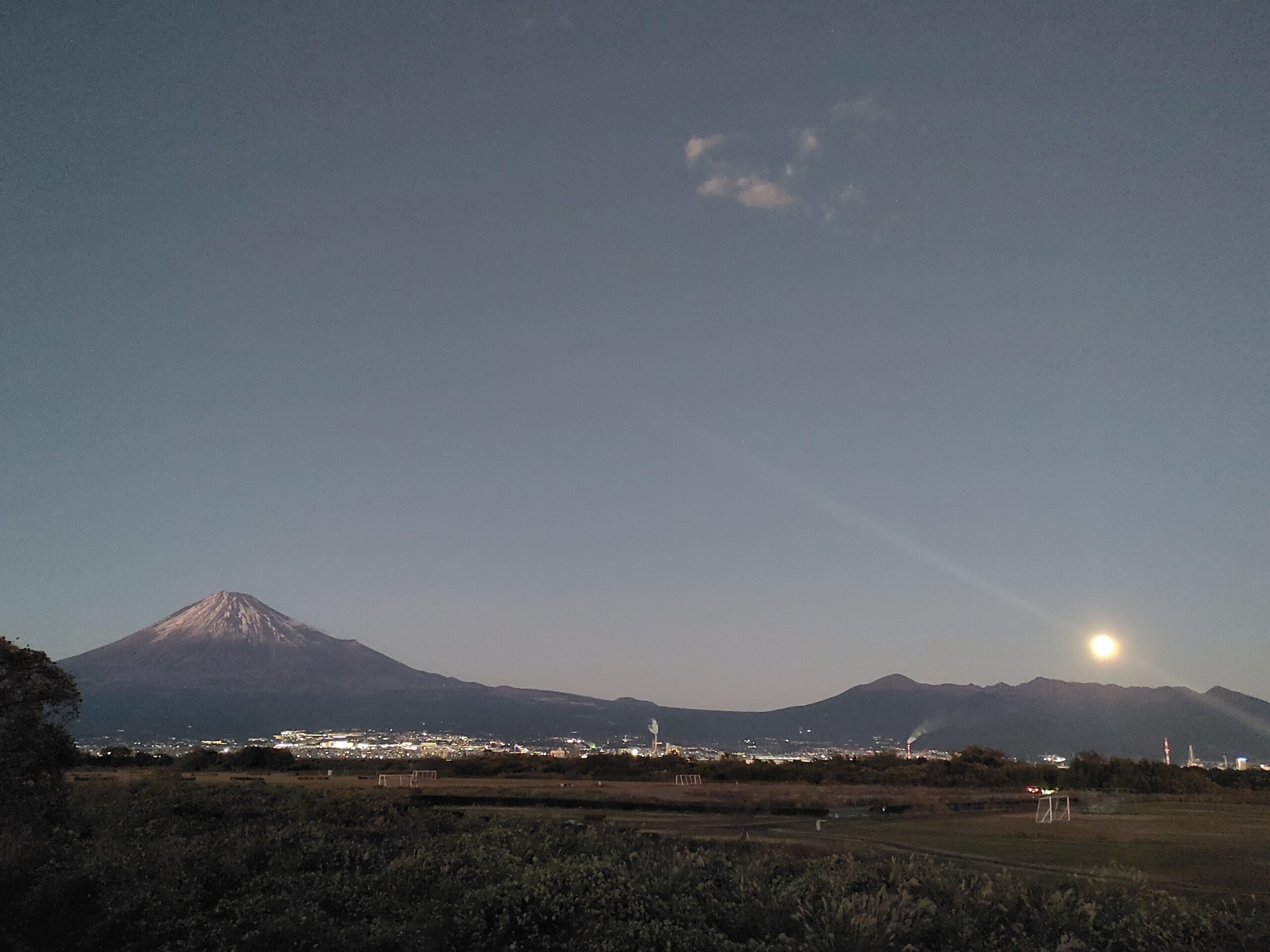 早朝にさようならした、お月さま。こんどは、富士山の脇から、顔を出した。丸くて美しい。