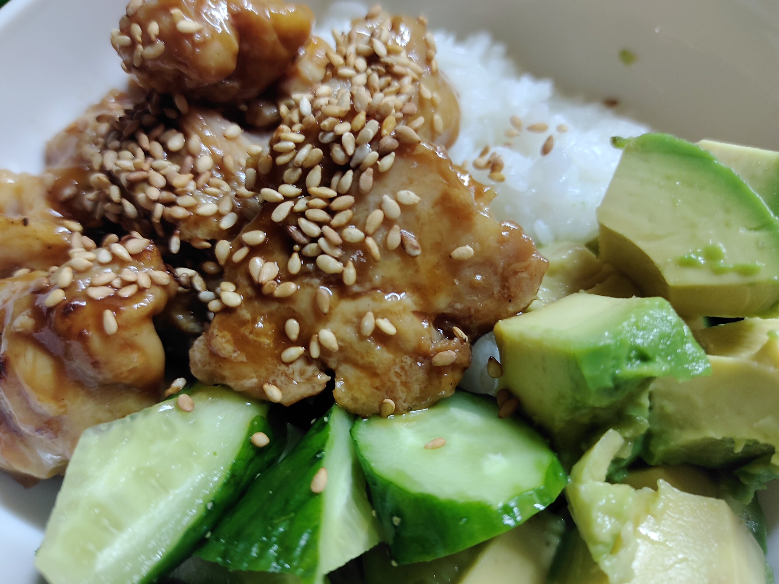 コープの焼きとりをほぐして、アボカドとキュウリでお丼。赤ワイン。