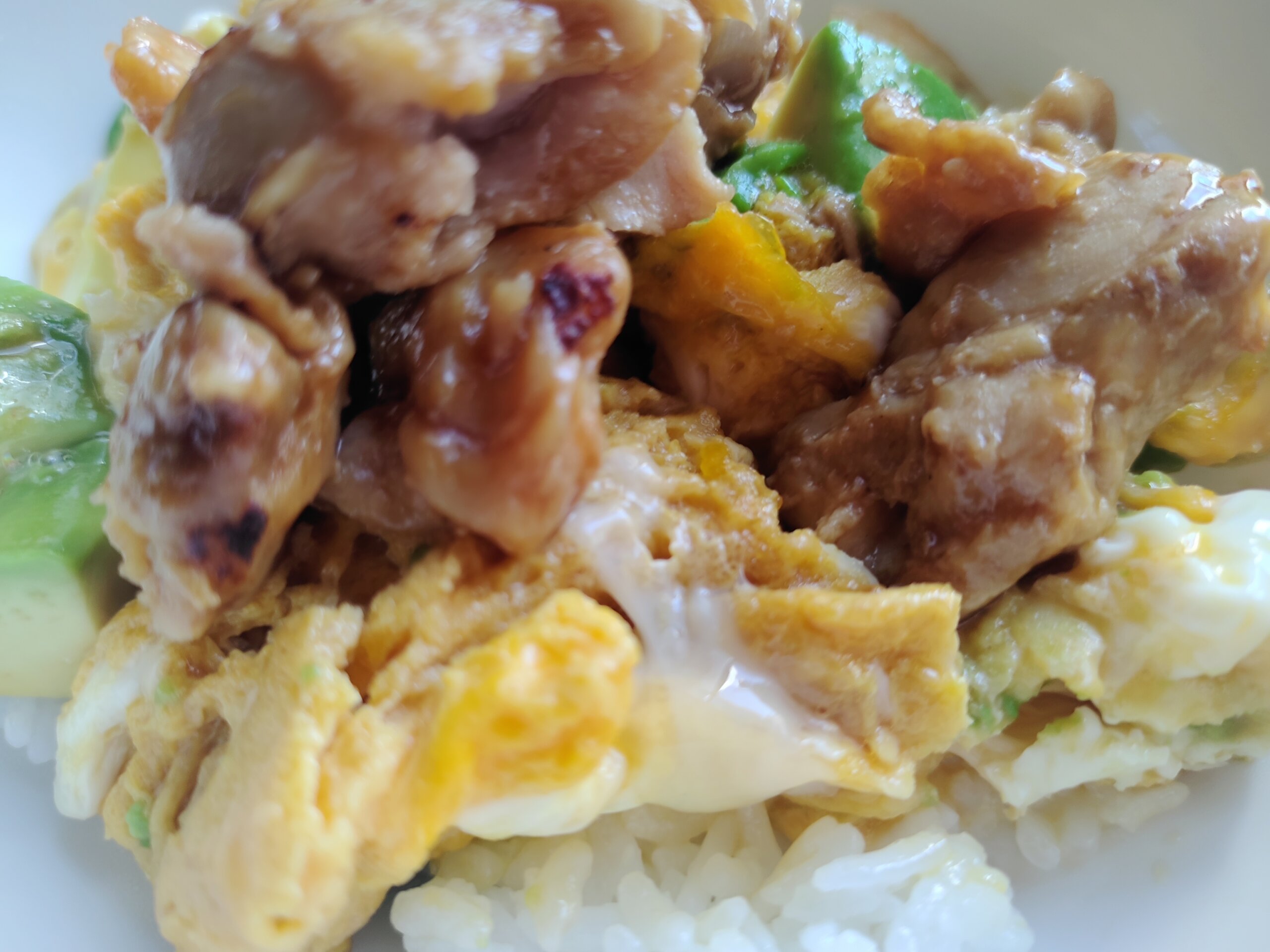 昼ごはんは、昨日の残り、やきとりとアボカドを玉子とじしたお丼