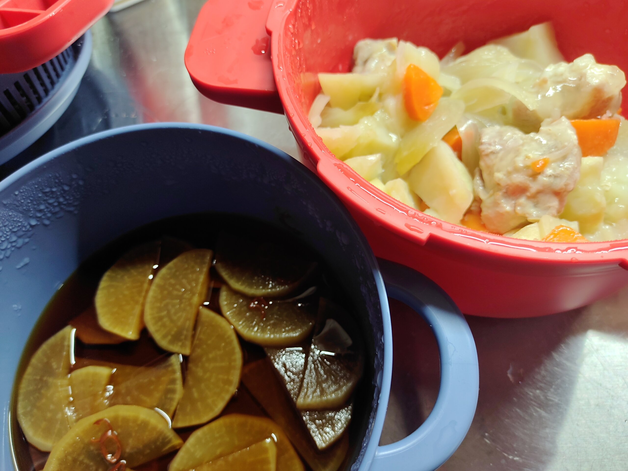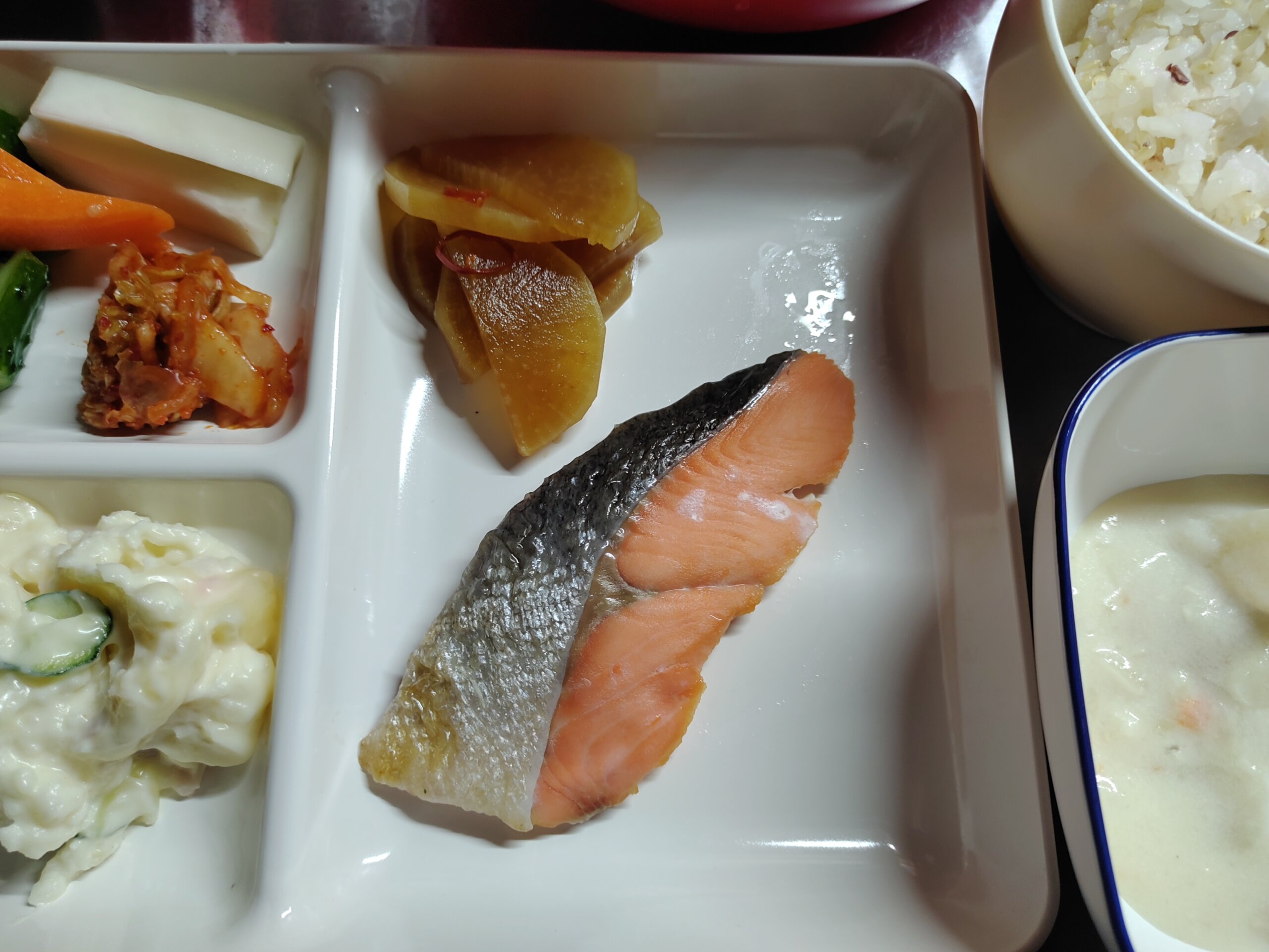 晩ごはんは、焼きシャケ、大根の煮物、キムチ、浅漬け、お肉屋さんのポテトサラダ、クリームシチュー。