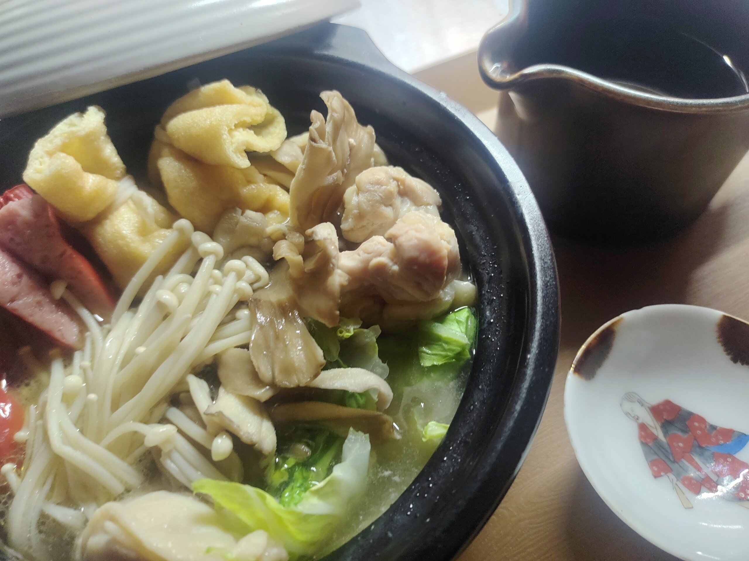 晩ごはんは、ひとりお鍋。冷蔵庫に余っているものなどで。〆をうどんかおじやどっちにしようと悩んだけれど、もち巾着を2個いれて、〆はなし。日本酒と。