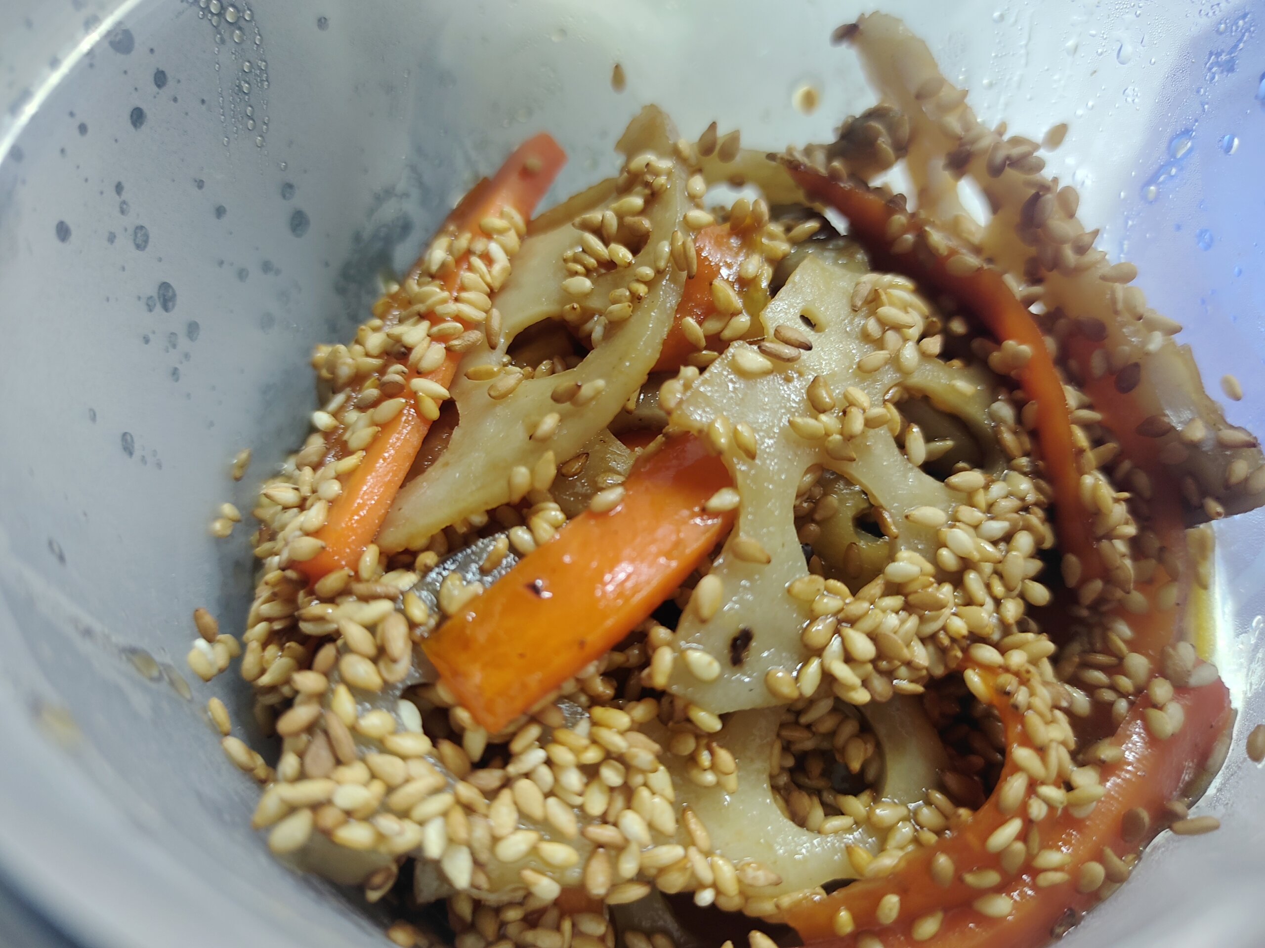 コンニャクや豆腐はあきらめる。豆腐いれると日持ちしないし。作ったのは、豚汁、レンコンとニンジンのきんぴら。ダイコンの浅漬け。ネギは、半分くらい冷凍。