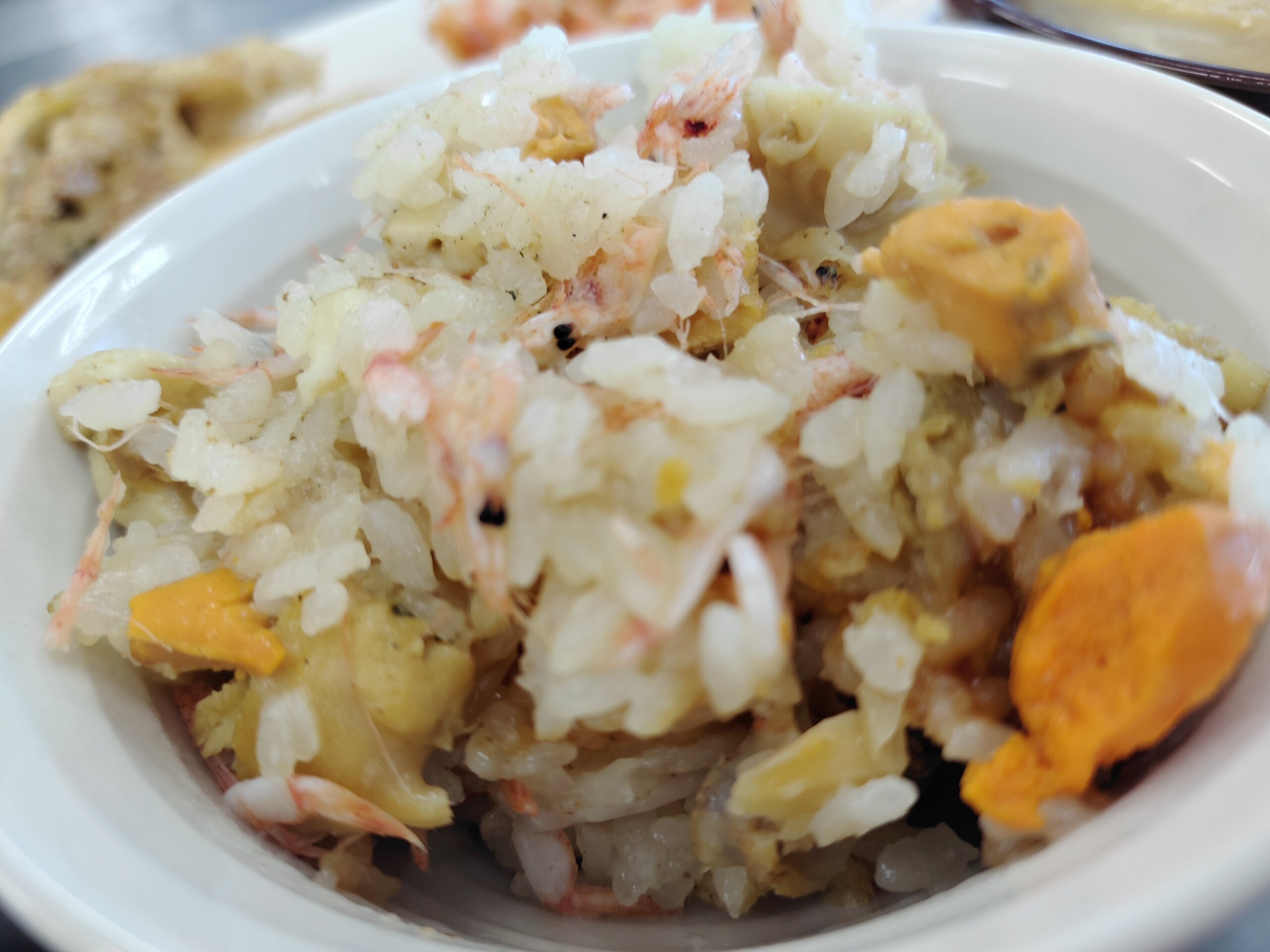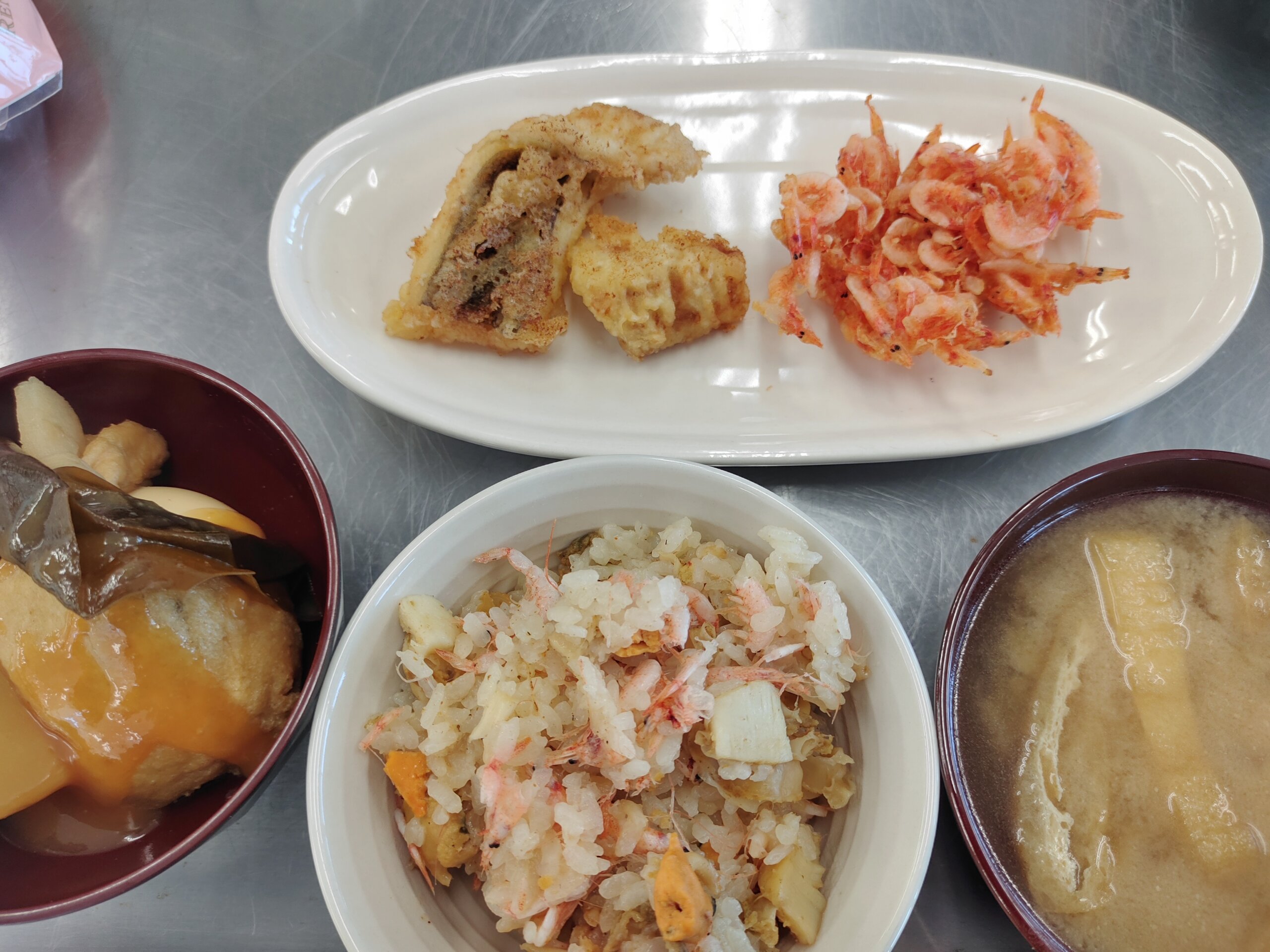 きょうのまかない。あなご、かさご、サクラエビ。ホタテの炊き込みご飯。